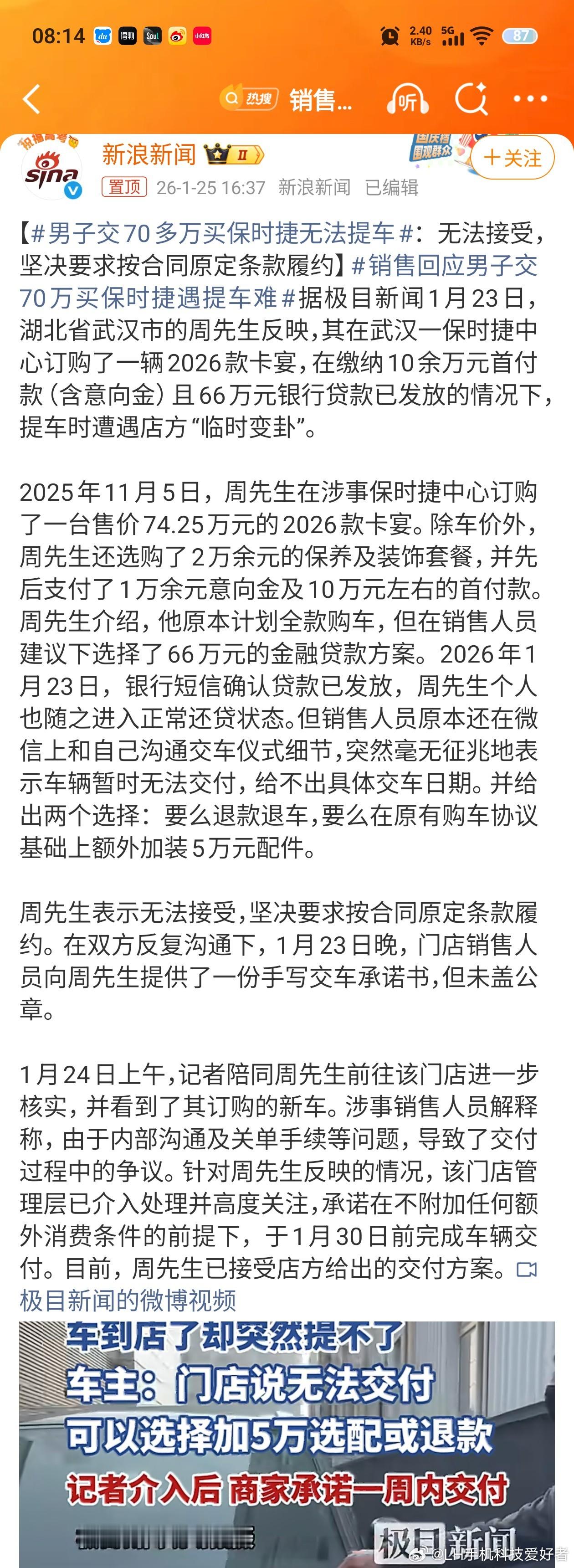 LH手机科技爱好者 这家保时捷店铺还是太傲慢,还以为是以前加价才能提车的时候呢?可以选择加五万选配,这是我认为最恶心的地方,逼着用户多花钱。不过,被媒体曝光后,这家店也老实了,说月底前会交付车辆。本来人家全款购车,非要让车主选择66万分期方案,只能说,为了赚钱啥事都干的出来啊。销售回应男子交70万买保时捷遇提车难