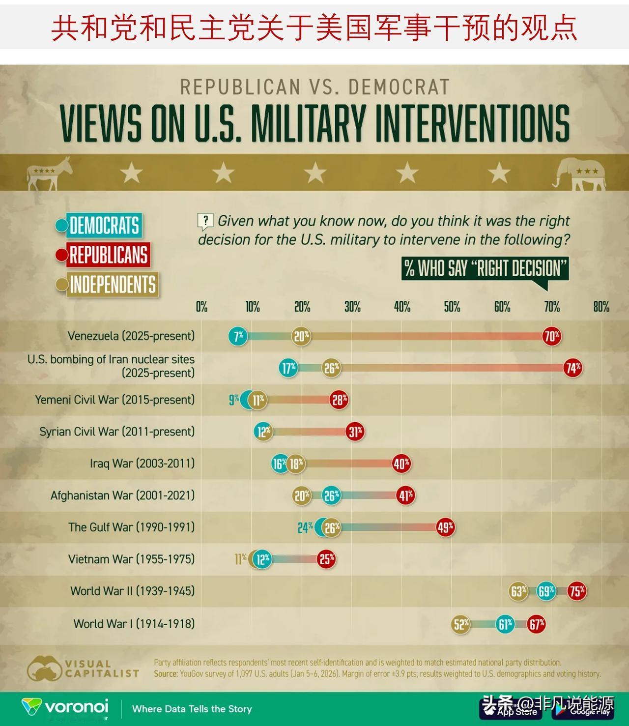 美国人如何看待美国的军事干预行动? 舆观调查网(YouGov)对美国成年人的一项新调查发现,对于美国在重大军事行动中的支持态度,存在着严重的党派分歧,包括近期有关委内瑞拉的争论以及对伊朗核设施的打击行动等。 YouGov 在 2026 年 1 月 5 日至 6 日对 1097 名美国成年人进行了调查。受访者被问及:“基于您目前所了解的情况,美国在各种冲突中的军事干预是否是正确的决定。” 政党归属反映了受访者的最新自我认定,并进行了加权处理,以与估计的全国政党分布情况相匹配。 ——在近期冲突事件中,党派之间出现了严重的分歧。 在 2026 年旨在将尼古拉斯·马杜罗总统从委内瑞拉赶下台的行动中,70.4%的共和党人认为这是正确的决定,而民主党人的这一比例仅为 7.4%。 同样,在关于美国轰炸伊朗核设施的事件上,74.2%的共和党人对此持赞成态度,而民主党人的支持率仅为 17.4%。 ——历史干预措施显示出一致的模式 在那些持续时间较长或具有历史意义的美国行动中,党派分歧也随处可见。 例如,在伊拉克战争问题上,共和党人的支持率(40.3%)高于民主党人(16.2%);在阿富汗战争和海湾战争问题上,情况也是如此。 即便是像越南那样的重大冲突事件,共和党人也更倾向于认为采取干预措施是合理的,而民主党人则持相反观点。 与此同时,独立派人士普遍对美国的军事干预行动持怀疑态度,他们对大多数冷战后的冲突的评价很低,而对第一次世界大战和第二次世界大战的支持率则居于较高水平。 ——关于世界大战干预的广泛共识 当存在明确的全国性共识时(比如二战)——两党都相对支持。共和党支持率为 75.2%,民主党为 68.7%。同样,对于第一次世界大战,共和党支持率更高,但民主党也不甘落后。