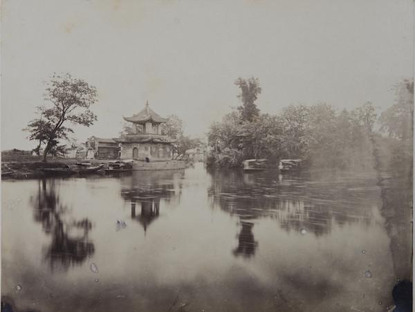 这张拍摄于1870年代的照片,是现存最早记录嘉定孔庙前汇龙潭、应奎山与魁星阁同框景象的影像之一。 汇龙潭水面如镜,清晰倒映出魁星阁与应奎山的轮廓。魁星阁的飞檐翘角与古朴亭身,在水面倒影的映衬下显得格外雅致,周围的树木与低矮建筑错落分布,构成了典型的江南园林式泮池景观。作为嘉定孔庙的配套建筑,魁星阁不仅是古代读书人祈求科举顺遂的象征,也承载着江南地区崇文重教的文化传统。