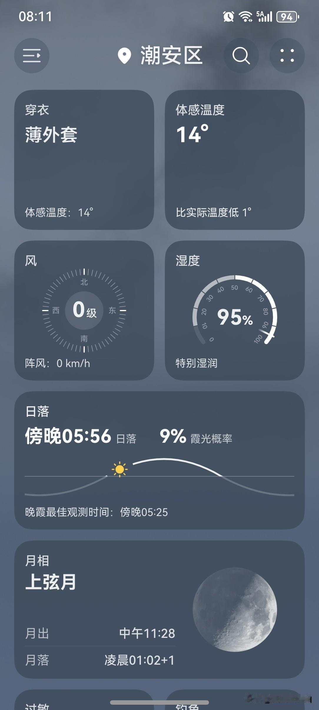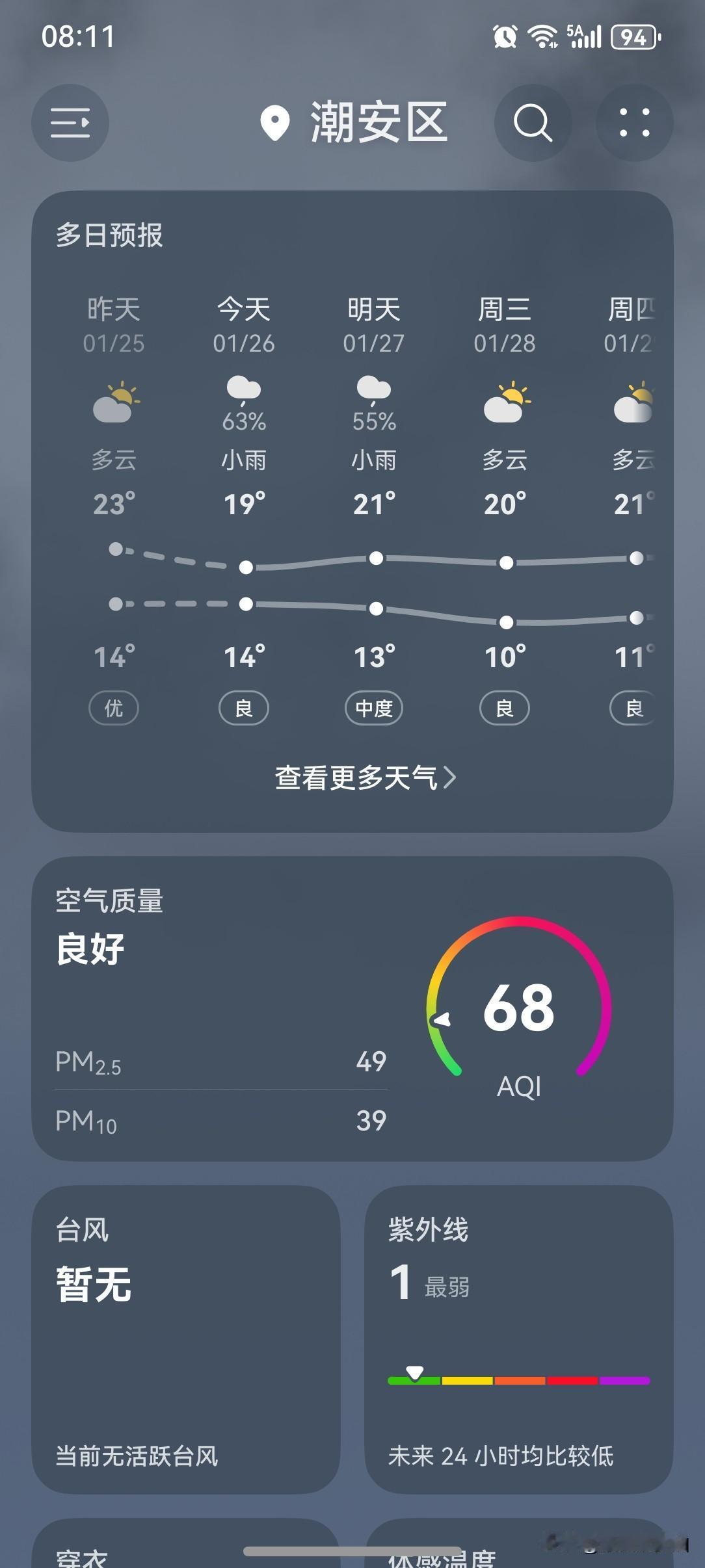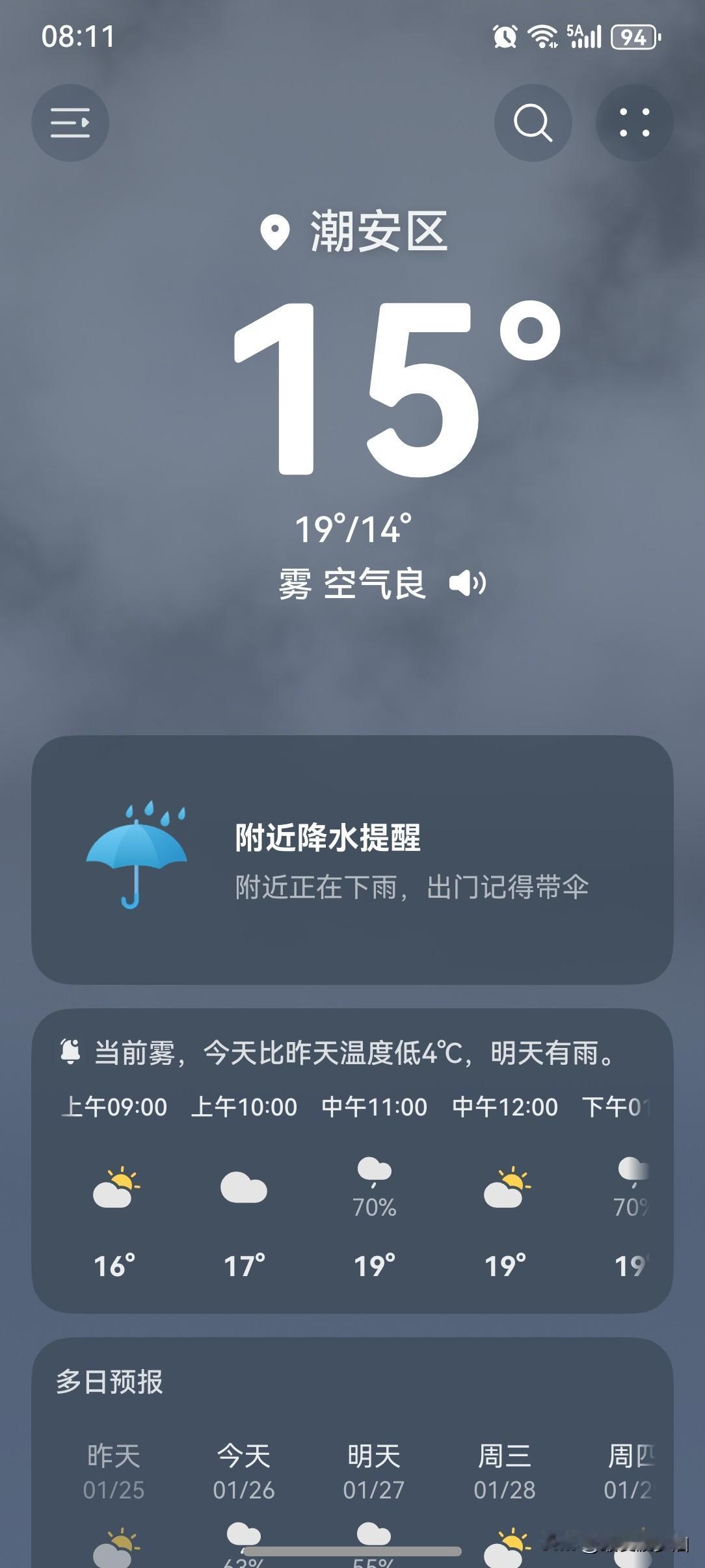 广东将迎“阿雨”和“阿冷”!雨雾天气来袭,湿度增大,还有冷空气也要来!部分市县昨天开始降雨,雨雾天气渐趋明显。 26~27日,广东将有一次小雨局部中雨的降水过程,雨雾天气能见度低;26日白天大部市县气温继续回升;26日夜间~28日有新的一股弱冷空气影响,我省大部市县有2~5C的过程累积降温。 今天(26日),潮州阴天有雨,气温14~19℃,此刻喜提15℃,体感温度14℃。 一起来看看今天的天空吧!烟雾弥漫,连空气都潮湿了几分。最怕这种天气了,空气湿度大,感觉就很回南!广东人最怕的就是回南天了! 再来看看气温方面,早上的气温比昨天还要再高一点,一点也不冷,穿着两件衣服出门刚刚好,一薄一厚,完美! 今天的气温相对来讲还是比较高,也算是暖和。但是阴天,还有点雾,空气湿度又大,甚是讨厌!思量许久,今天这天气,只能差评了哈! 如此天气!元芳,你怎么看? [我想静静][捂脸][大笑][笑哭][我想静静][捂脸][大笑][笑哭]