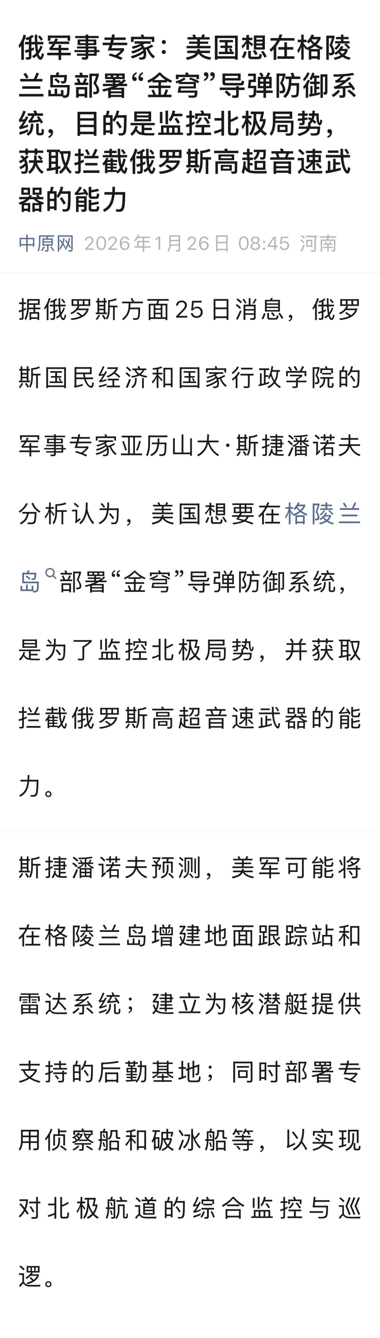 俄军事专家关于美国意图在格陵兰岛部署“金穹”系统以监控北极、获取拦截俄高超音速武器能力的分析,与已公开的美方表态及事态发展相符。