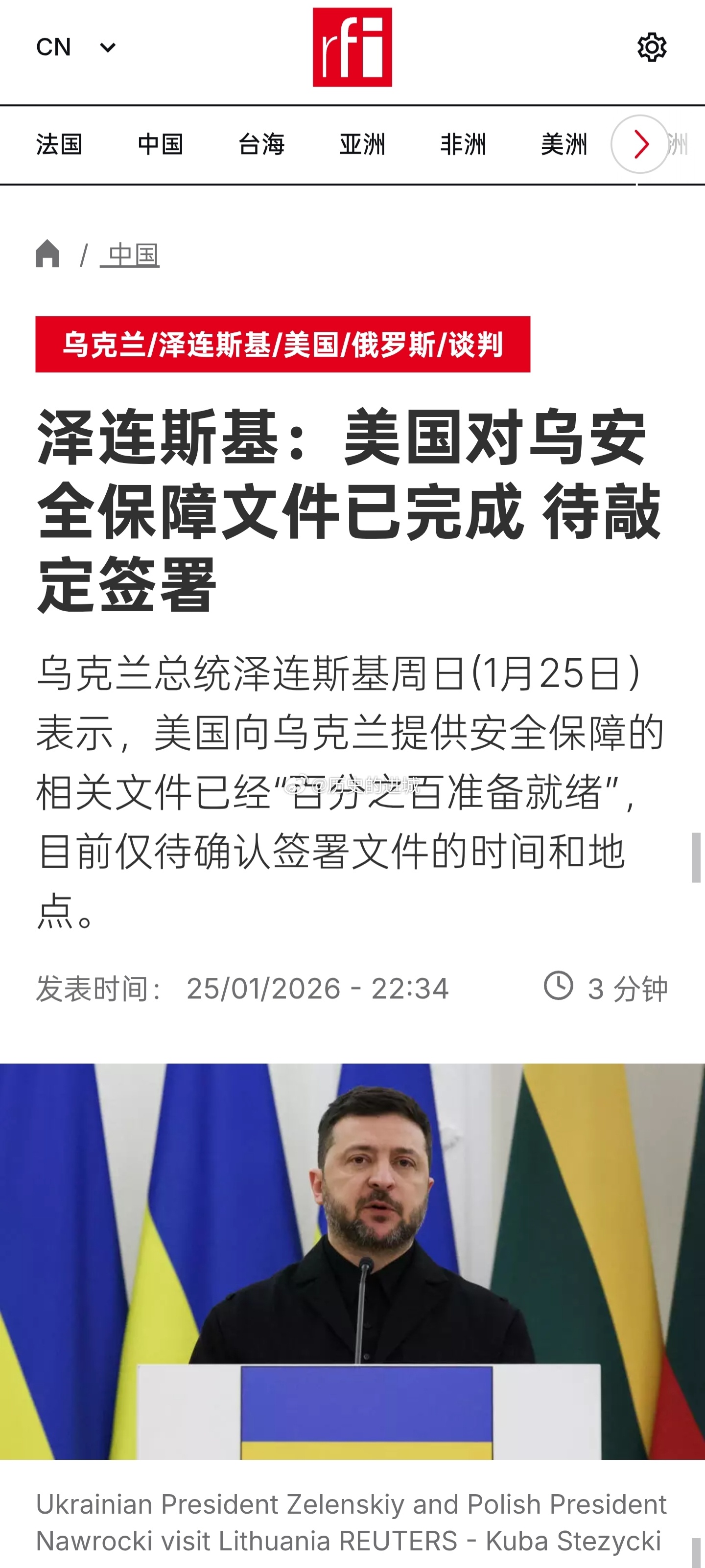 乌克兰总统泽连斯基周日(1月25日)表示,美国向乌克兰提供安全保障的相关文件已经“百分之百准备就绪”,目前仅待确认签署文件的时间和地点。泽连斯基同时表示,上周末乌克兰与俄罗斯代表在美国斡旋下于阿布扎比举行的会谈,虽然未能达成协议,但在若干关键问题上取得进展,使此前积累的棘手问题有所减少。各方均表示愿意继续对话,下一轮会谈预计将于下周在阿布扎比举行。海外新鲜事