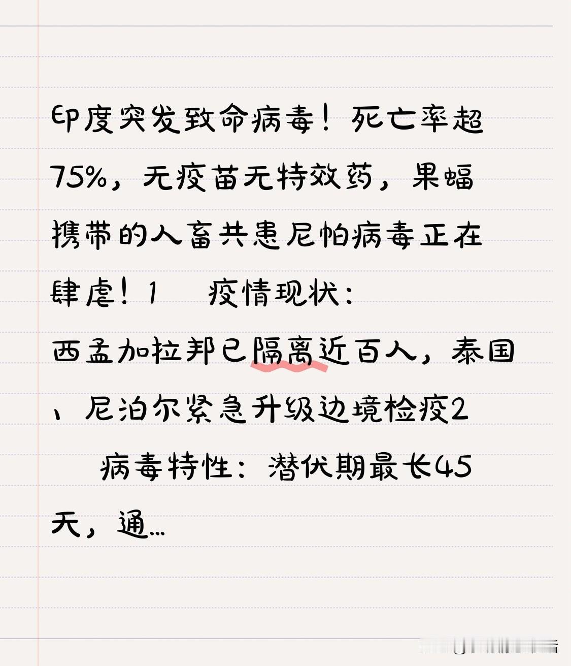 印度惊现致命病毒!尼帕病毒为人畜共患,由果蝠携带,死亡率超75%,且无疫苗和特效药,正疯狂肆虐。 疫情现状:西孟加拉邦近百人被隔离,泰国、尼泊尔紧急加强边境检疫。 病毒特性:潜伏期最长45天,经唾液、尿液污染食物传播,幸存者可能留后遗症。 防疫重点:勿接触果蝠、生饮椰汁,处理肉类要戴手套。 此病毒比新冠更凶险,已逼近国门!转发收藏防疫指南,点赞关注获疫情动态!病毒致死率