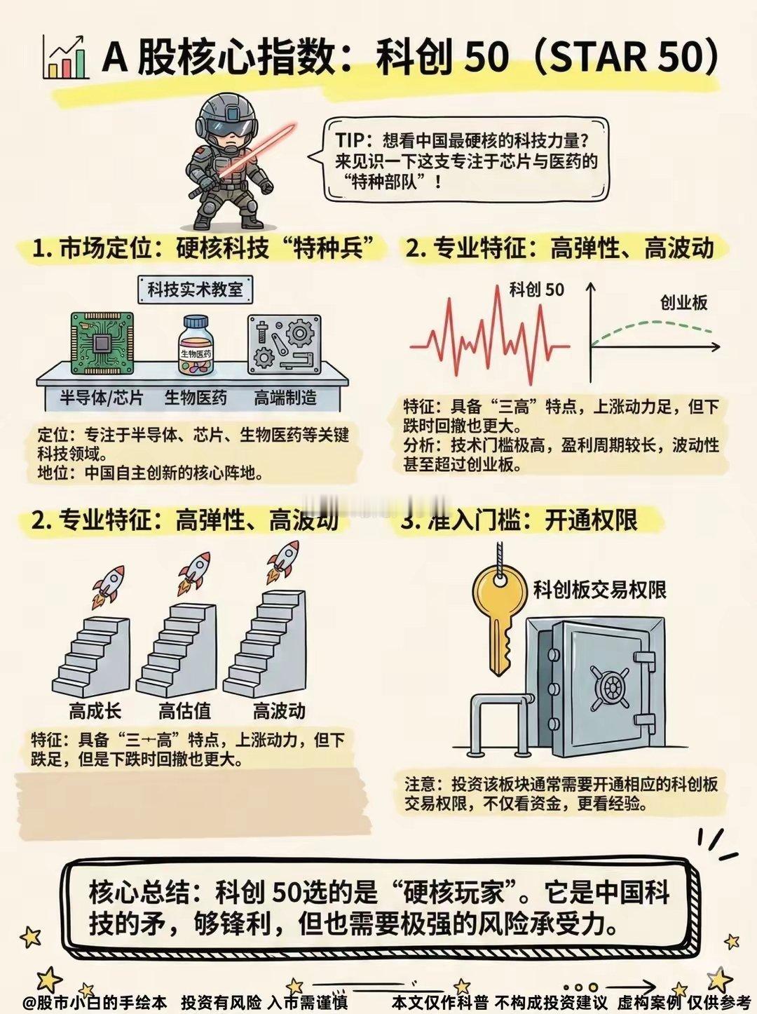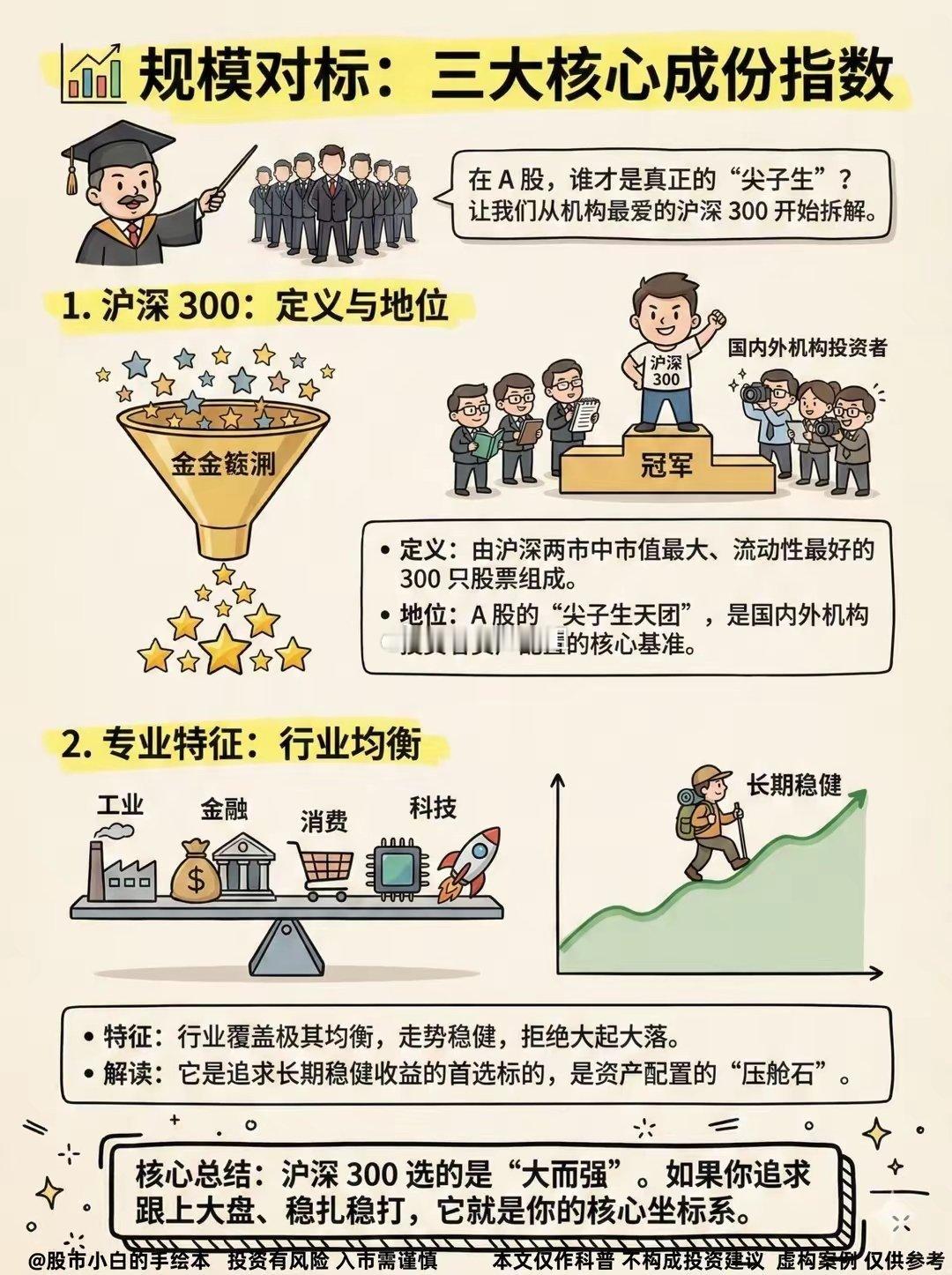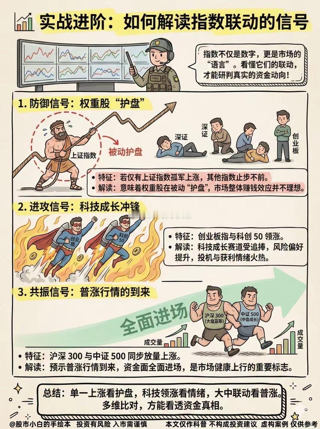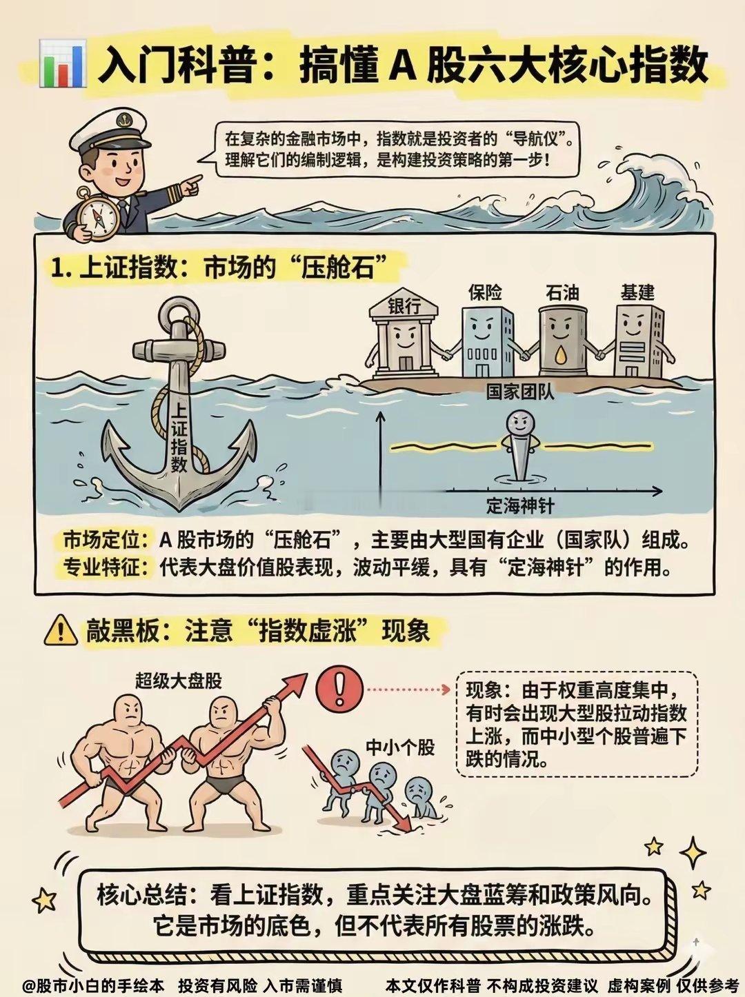 搞懂A股六大核心指数—图解金融(第十七期)刚入场的小伙伴,是不是经常被这些名词绕晕:上证指数、沪深300、创业板、科创50…… 它们到底代表什么?为什么有的在涨,有的在跌? 其实,指数不仅是数字,更是市场的“语言”。读懂了指数背后的逻辑,你才能看清资金的真实动向!👇 🔍 1. A股的“压舱石”:上证指数 & 沪深300 * 上证指数: 市场的底色,以大型国企为主,是定海神针,但要注意“指数虚涨”现象。 * 沪深300: A股的“尖子生天团”,覆盖行业均衡,是国内外机构配置的核心基准,追求稳健的首选。 🚀 2. 成长的“引擎”:深证成指 & 中证500 * 深证成指: 民营经济的晴雨表,专注制造与成长。 * 中证500: 未来明星的“孵化器”,侧重细分行业的龙头,兼具稳健与弹性。 🔥 3. 科技的“尖刀”:创业板指 & 科创50 * 创业板指: 高科技企业的集中营,弹性极强,但回撤也大,适合风险承受能力高的玩家。 * 科创50: 硬核科技的“特种部队”,专注半导体、芯片、生物医药,是科技之矛,但也需要极强的耐受力。 💡 如何解读指数联动的信号? * 防御信号: 只有上证涨,其他止步不前 ➡️ 可能是权重股在被动“护盘”。 * 进攻信号: 创业板与科创50领涨 ➡️ 市场风险偏好提升,投机情绪火热。 * 共振信号: 沪深300与中证500放量齐涨 ➡️ 全面进场,市场健康上行的重要标志! ⚠️ 声明 * 科普性质: 本文仅作金融知识普及,旨在帮助大家建立理性的市场观察框架。 * 不构成建议: 文中提及的所有指数及行业描述均为客观特征分析,不构成任何投资建议或买卖指导。 * 虚拟案例: 图中示例及解读仅供参考,不预示未来市场表现。 * 风险提示: 市场有风险,入市需谨慎。请根据自身的风险承受能力,理性规划,切勿盲目跟风。打卡互联网金融
