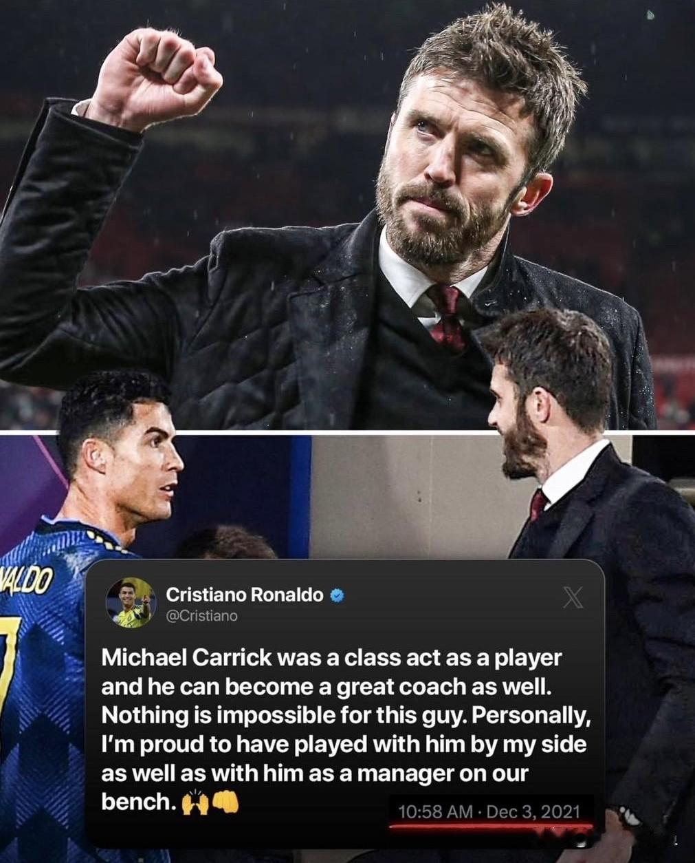 C罗的“预言”再一次被验证,他说的绝对真实! 4年前C罗就曾预言他曾经在曼联的队友卡里克会成为一名伟大的教练。他说过,卡里克作为球员时是一位杰出的球员,如果成为教练,他也能成为一名伟大的教练。对他来说,没有什么是不可能的。 作为曾经一起并肩作战的队友,他无比坚信自己的预判。卡里克是一位自律的球员,自律会使他在任何他想成功的路上迈向成功。作为曾经的战友他感到自豪。