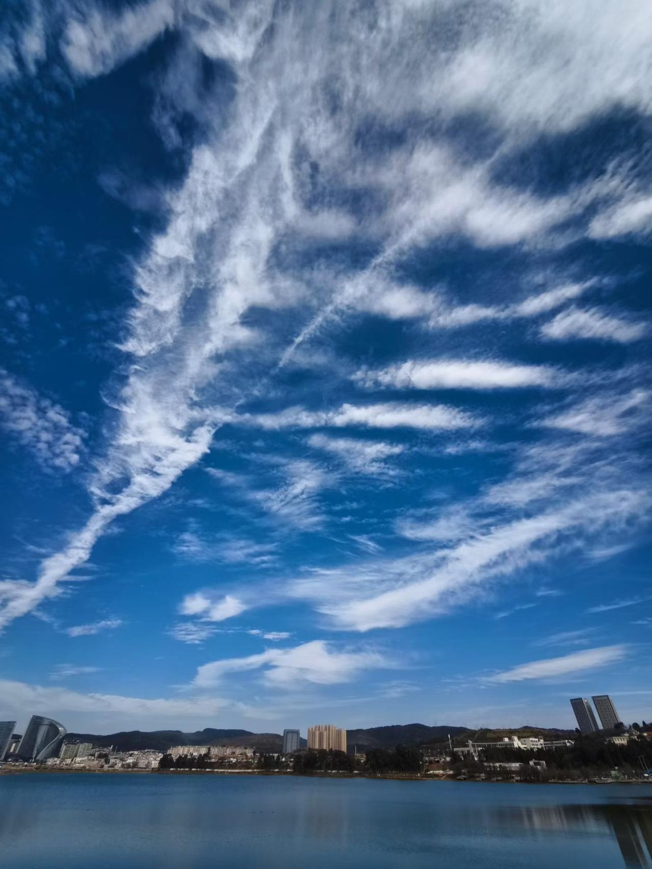 哟,这清晨的洱海可太美了! 天刚亮,水面就跟一块没睡醒的大蓝镜子似的,安安静静,透亮透亮的。远远看去,城市的房子高高低低排在那儿,后头就是一片青灰色的山,朦朦胧胧的,像还没睁开眼。 最抓人的还是这天!干干净净的蓝底儿上,白云玩儿得正欢。它们一点也不老实,有的拉得长长的像飘带,有的软乎乎地堆在一起,就像刚扯出来的棉花糖,在天上随意铺开,看着就让人心里头松快。 整个画面就是一片清爽的蓝和白,空气好像都是凉丝丝、甜润润的。看着这景儿,什么烦心事儿都忘了,只剩下“舒坦”俩字儿! 洱海