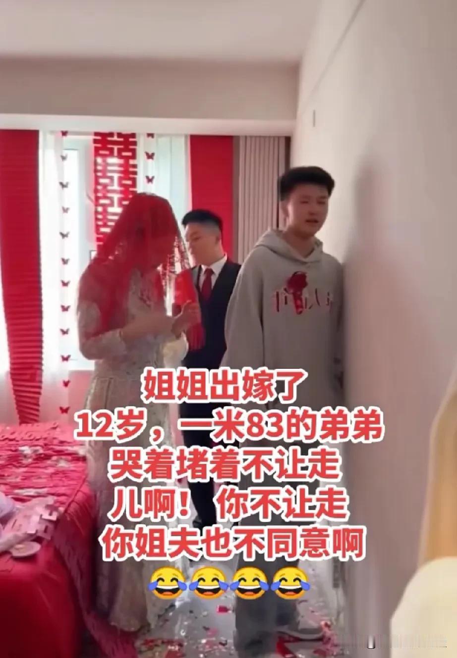 姐夫红包没给够呀。姐姐出嫁,12岁的弟弟都1米83的身高了,哭着不让姐姐走。可能才12岁,心智还不成熟,对姐姐有依赖性,认为姐姐一出嫁走了,都成了别家的人了,以后由亲人变成亲戚了。 网上说他才12岁,可能不理解其中什么意思,如果他要18岁,他可能就不会这么做了。