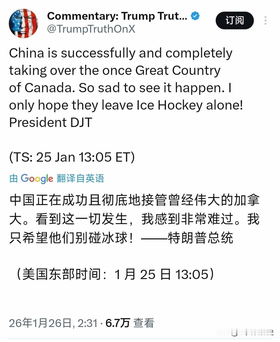 特朗普今天(北京时间1月26日)发文写道:“中国正在成功且彻底地接管曾经伟大的加拿大。看到这一切发生,我感到非常难过。我只希望他们别碰冰球!” 读完这段话,感觉像是从一出夸张的好莱坞剧本里直接摘出来的台词。一个国家的正常贸易合作,被描绘成惊悚的“接管”大戏,这种叙事本身就很值得玩味。 所谓的“彻底接管”,指的其实是加拿大总理卡尼八年来的首次访华。双方谈的是实打实的生意:加拿大每年允许4.9万辆中国电动汽车以合理关税进入市场,中国则调整对加拿大油菜籽等农产品的措施。这就是互惠互利,各取所需,哪来什么“生吞活剥”? 特朗普嘴上说着“非常难过”,行动上却毫不含糊。他此前威胁,只要加拿大与中国达成协议,美国就将对其所有商品征收100%的关税。这种从“难过”到“威胁”的迅速切换,暴露的或许不是担忧,而是焦躁。 加拿大方面显得很冷静。其贸易部长明确表示,这并非一项全面的自由贸易协定,只是解决了“几个重要的关税问题”。加拿大的经济体量排全球第十,它与中国年贸易额近6000亿元人民币,这样的合作规模是正常的国家交往。 戏剧性的是,就在卡尼访华后不久,特朗普还说过加拿大与中国签贸易协议“是件好事”。几天之内态度180度大转弯,这种反复让承诺的分量大打折扣。悬而不落的“100%关税”利剑,更像是一种施加压力的谈判工具。 特朗普曾嘲讽式地称呼加拿大总理为“卡尼州长”,流露出一种将加拿大视为附属的傲慢。当这个“州长”不再唯命是从,开始独立寻求符合本国利益的经济伙伴时,那种掌控力流失的焦虑便化为了激烈的言辞。 中加合作内容广泛,从农业、清洁能源到打击跨国犯罪,双方还续签了2000亿元人民币的本币互换协议。这些实实在在的规划,与煽动性的“接管”故事截然不同。合作基于规则,旨在稳定,这才是国际交往的常态。 当一种叙事过于离奇夸张时,我们或许应该少看它说了什么,多看它为何这么说。激烈的情绪输出背后,往往是某种现实影响力的博弈。加拿大只是想“在菜单上,而是坐在谈判桌上”,这触动了某些人敏感的神经。 各位读者你们怎么看?欢迎在评论区讨论。 欧洲对特朗普 聊特朗普 特朗普外交突袭 特朗普表 加拿大对华关系