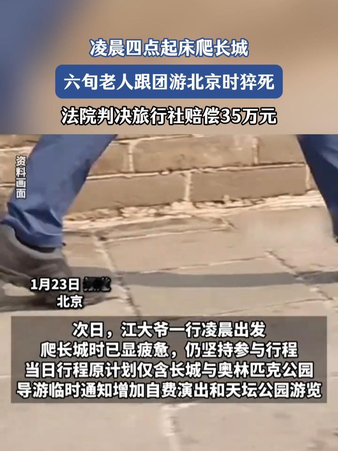 六旬老人跟团游猝死,连续两日凌晨集合引发争议,旅游公司需赔偿35万余元。 六旬老人江大爷参加北京五日游期间因身体不适猝死,引发了广泛关注。事件发生在2024年7月,江大爷与亲友一同报名参加某旅游公司的跟团游项目。然而,行程中导游连续两日凌晨集合,且临时增加景点导致行程密度过大,加剧了江大爷的身体负担。家属认为旅行社未尽到安全保障义务,将旅行社告上法庭,最终法院判决旅游公司需赔偿35万余元。此案凸显了老年人跟团游的安全隐患以及旅行社的责任担当。 老年团队游