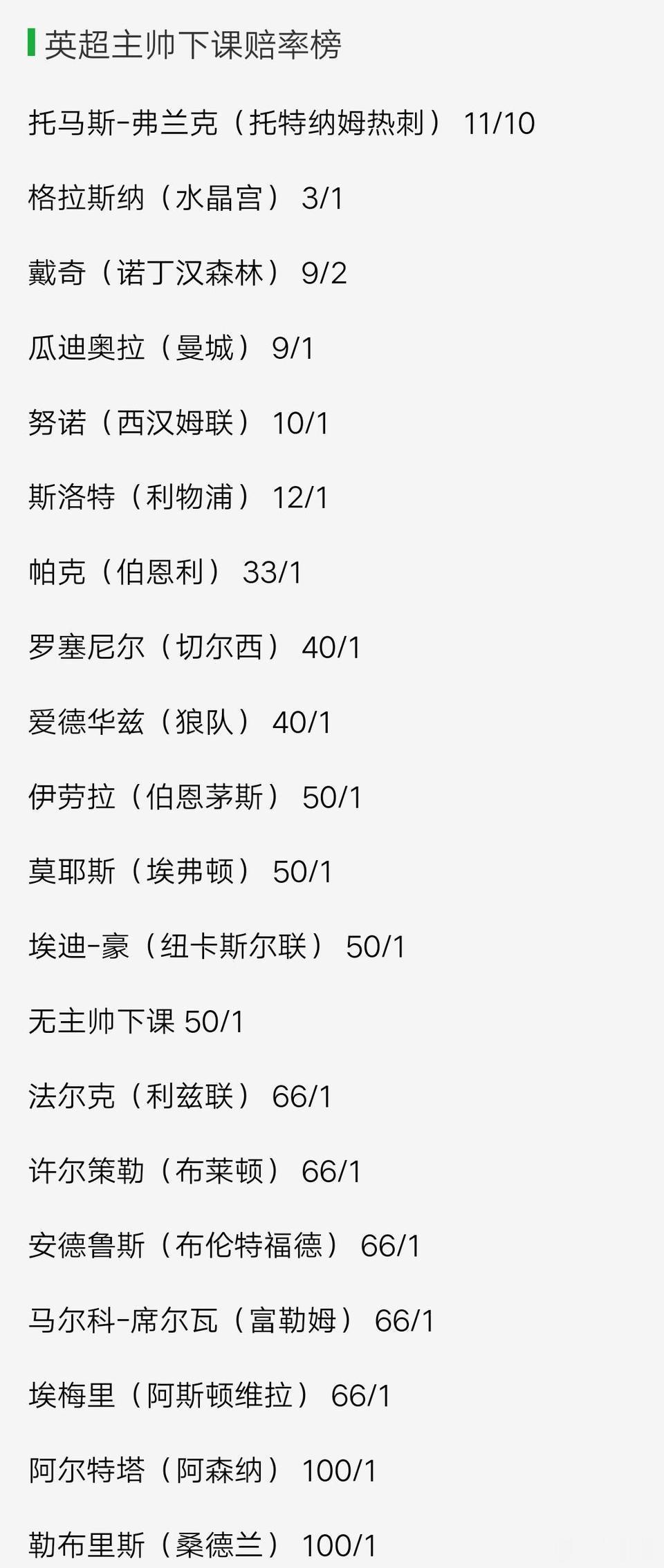 英超最新主教练下课赔率。 热刺在降级区,哪怕欧冠表现好,跟上赛季一样吗? 水晶宫那是格拉斯纳不想续约。 诺丁汉森林在保级区。 西汉姆联接近保级区。 利物浦离开前五,阿隆索准备? 刚刚曼联,切尔西换帅,一年英超得换多少教练呀?真是高强度联赛。[笑哭]