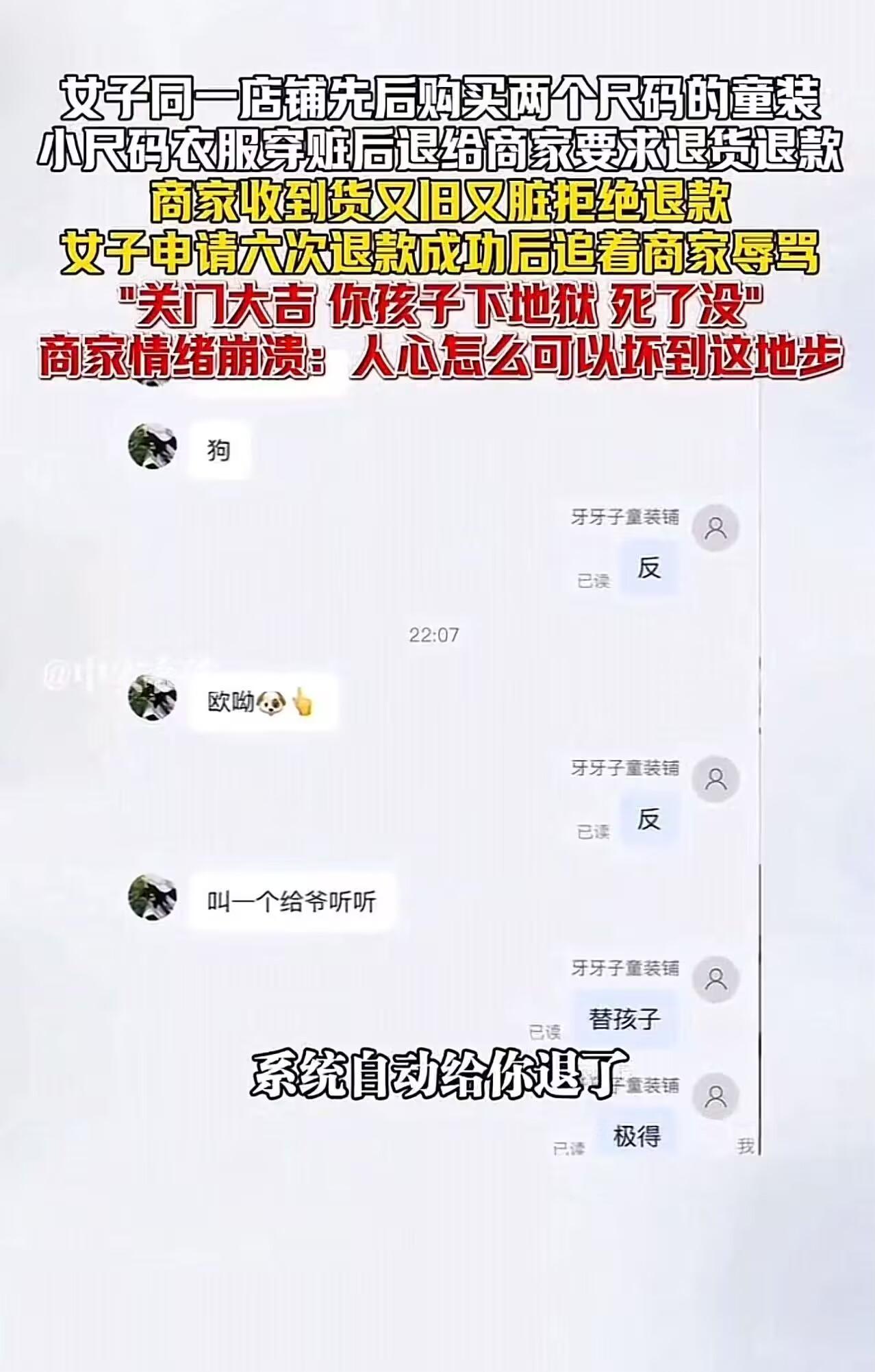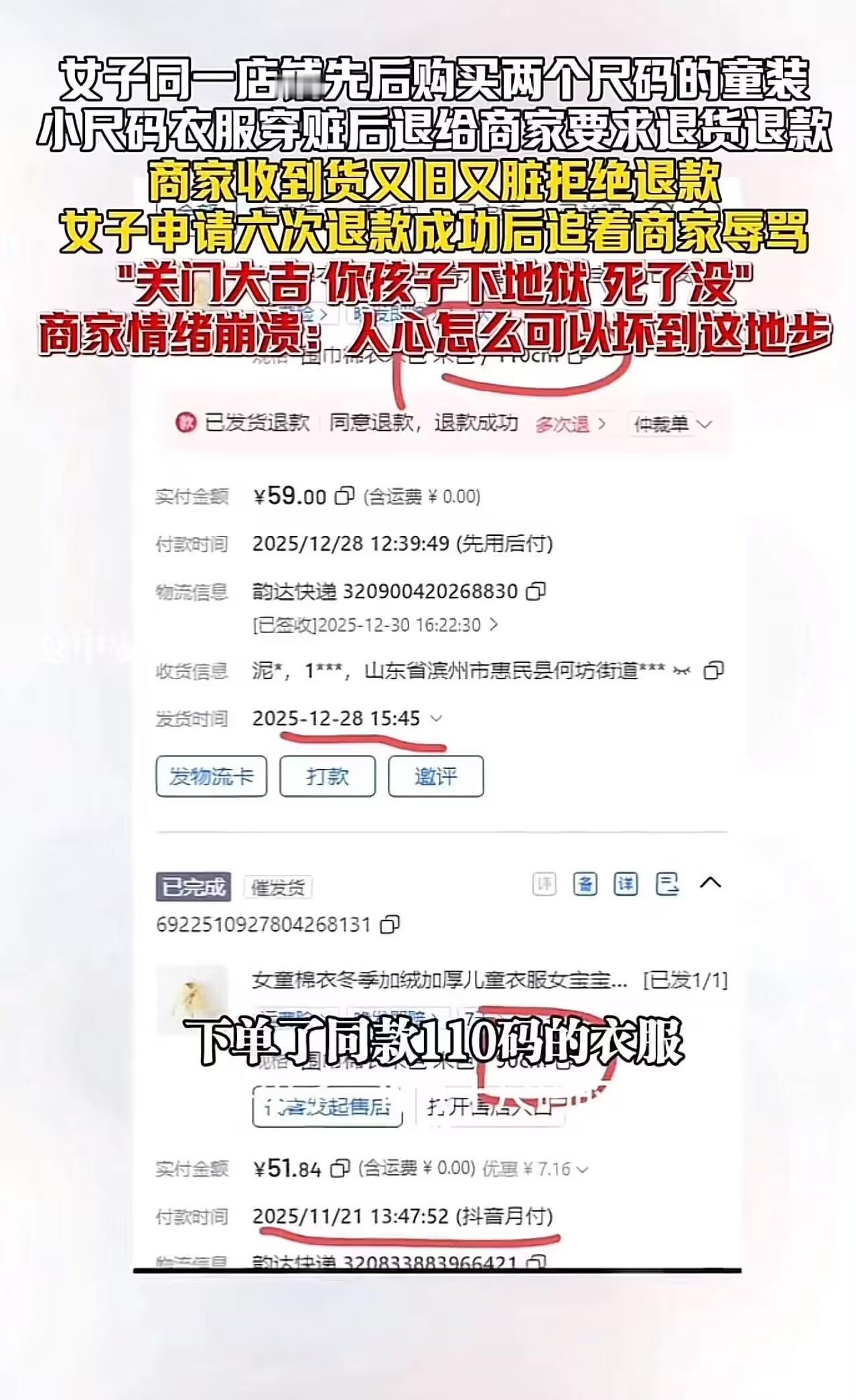 “不惯着,贴脸开大!”某记者网购童装,穿的又脏又旧后申请退货退款,商家拒绝退款,该记者私信辱骂商家:“关门大吉,你孩子下地狱!”商家情绪崩溃,发视频怒斥:人心怎么可以坏到这地步?你作为妈妈给孩子穿着你白嫖来的衣服,你对得起你的孩子吗? 2025年12月,山东滨州惠民县一家小型童装网店迎来一笔“噩梦订单”。 买家王女士(后证实为当地融媒体中心记者)先后下单两件童装:11月21日买90码,12月28日又买110码。 可12月30日,她突然申请110码衣服的“退货退款”。 商家按流程同意,并耐心等待退货。可当包裹寄回、拆开一看,她当场傻眼——退回的不是110码新衣,而是一件又脏又旧、明显穿过的90码衣服!领口发黄、袖口起球,还沾着污渍。 商家立刻联系王女士:“您寄错货了,我们发的是110码,您退的是90码,而且衣服已经穿脏,无法二次销售。” 她好心将衣服原路寄回,并拒绝退款——毕竟,谁会收一件被穿脏的“二手童装”? 没想到,这一拒绝,竟引爆对方的“核弹级”攻击。 王女士不仅连续6次在平台发起售后纠缠,还在私信中对商家进行恶毒人身攻击: “你这种店就该关门大吉!你孩子下地狱!” 深夜,小陈看到消息,情绪彻底崩溃。 她在视频中哭诉:“你是一个妈妈,却给孩子穿白嫖来的脏衣服;你还是个记者,却用最恶毒的话诅咒别人的骨肉……人心怎么能坏到这种地步?” 视频曝光后,舆论海啸般袭来。 面对汹涌民愤,惠民县融媒体中心迅速通报:涉事员工已主动辞职。 网友怒评:这不是“七天无理由”,是“七天无底线”! “我试鞋都用湿毛巾擦干净鞋底,包装纸一层层复原再退!人家小本生意,你穿脏了还倒打一耙?” “作为山东人,我为她感到羞耻!支持店主报警!辱骂‘孩子下地狱’已涉嫌恐吓,可拘留!” “记者身份不是特权!如果连基本诚信都没有,还配做舆论监督者?” 更多普通消费者发声: “我们退货都像做贼一样小心:吊牌不剪、包装完好、连快递袋都不敢撕坏。就怕卖家为难,更怕影响人家再卖。” “小商家一天赚几十块,你一件脏衣服就毁掉他们三天收入——这叫‘维权’?这叫抢劫!” 【评语】 这件穿脏的童装,照出的不是尺码错误,而是某些人把“消费者权益”扭曲成“道德豁免权”的丑陋嘴脸。 “七天无理由退货”本是保护弱势消费者的善意制度,却被一些人当成免费试穿、恶意退货、甚至敲诈勒索的工具。 而当这位记者以“媒体人”身份施压、用“诅咒孩子”泄愤时,她践踏的不仅是商家尊严,更是整个社会的信任基石。 更讽刺的是,一个本该守护公平正义的新闻从业者,却在自家孩子身上实践“白嫖哲学”—— 她教给孩子的,不是诚实,而是如何利用规则占便宜; 不是尊重他人劳动,而是“我弱我有理”的丛林逻辑。若连“穿过的衣服要洗干净再退”这种基本道德都需要法律强制,那我们的文明,早已病入膏肓。 请记住:真正的体面,不在职业头衔,而在你退回包裹时,是否对得起那个素未谋面、靠双手吃饭的小店主。 否则,你省下的那几十块钱,终将成为孩子人格上的永久污点。