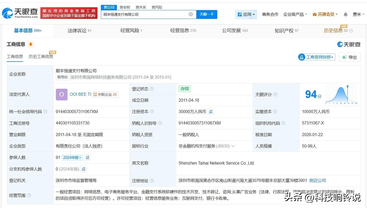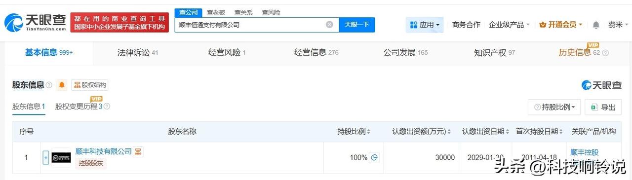【顺丰恒通支付公司增资至3亿 增幅200%】 天眼查工商信息显示,近日,顺丰恒通支付有限公司发生工商变更,注册资本由1亿人民币增至3亿人民币,增幅200%,同时,部分主要人员发生变更。 顺丰恒通支付有限公司成立于2011年4月,法定代表人为OOI BEE TI,经营范围包括网络信息、电子商务服务平台、金融支付系统软硬件的技术开发、技术转让、咨询等。股东信息显示,该公司由顺丰科技有限公司全资持股。 天眼查信息: