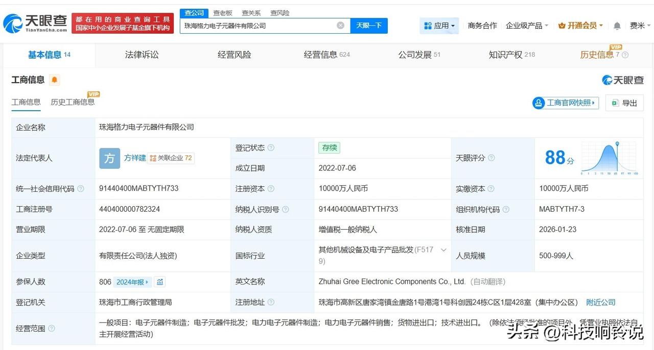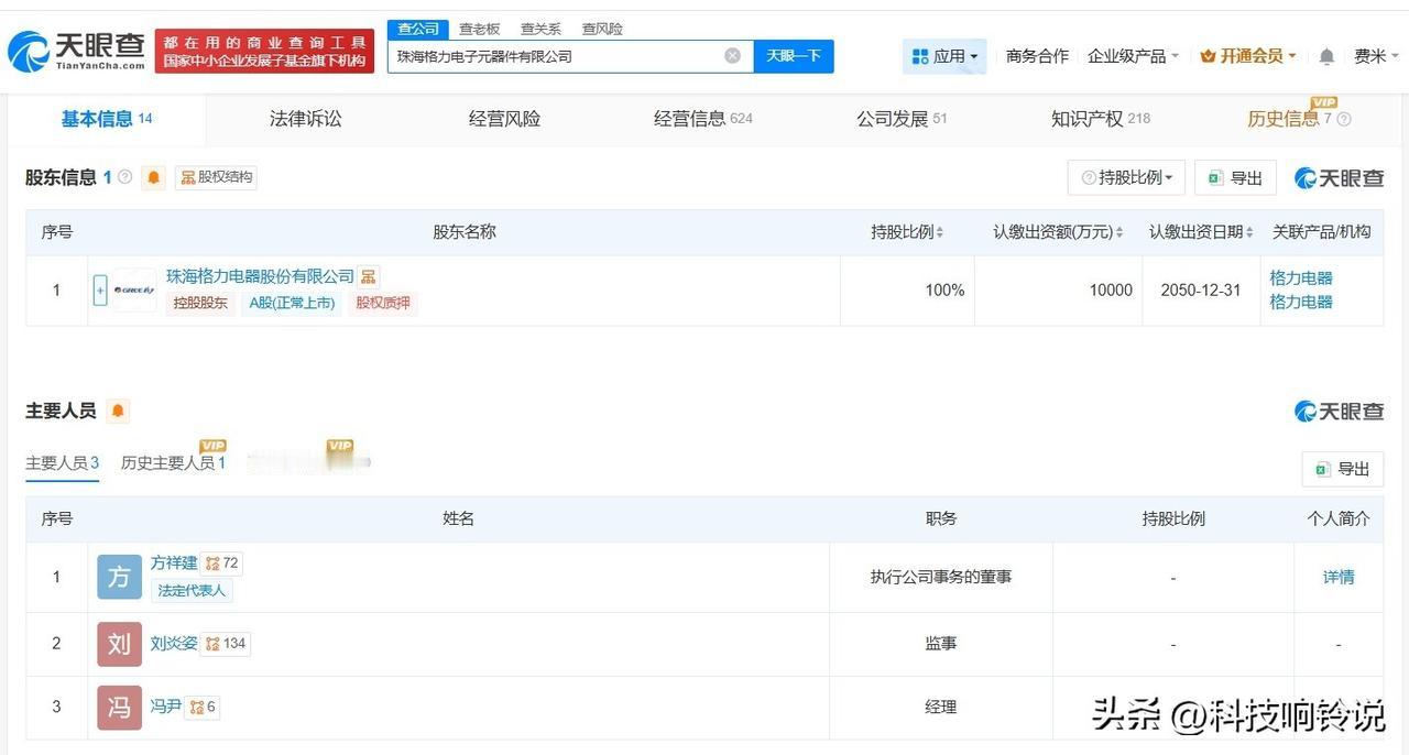 【董明珠退出格力电子元器件公司 董明珠卸任格力电子元器件公司职务】 天眼查工商信息显示,近日,珠海格力电子元器件有限公司发生工商变更,董明珠卸任法定代表人、执行董事,方祥建接任法定代表人并担任执行公司事务的董事。 珠海格力电子元器件有限公司成立于2022年7月,注册资本1亿人民币,经营范围包括电子元器件制造、电子元器件批发、电力电子元器件制造等。股东信息显示,该公司由格力电器(000651)全资持股。 天眼查信息: