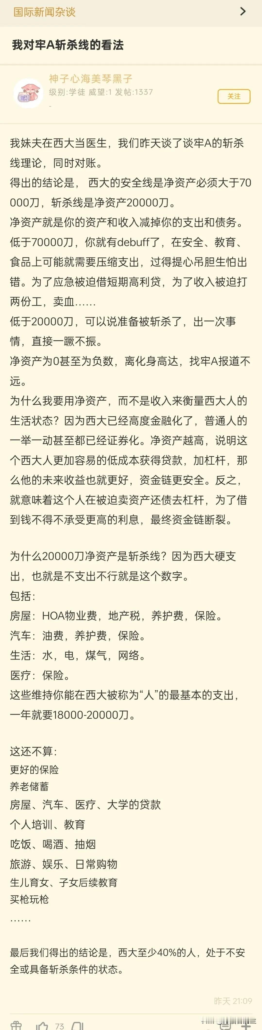 美国本质上就是由少数政治家族和经济财阀控制的资本奴隶社会! “斩杀线”揭开了美式资本主义的阶层分化和剥削本质的冰山一角! 斯奎奇大王牢A并不是只有他接触了美国底层真相,但是只有他揭露了美国的真相! 如果没有设身处地的体验,是无法描述那么多细节。 但凡有点脑子的都知道,牢A说的是美国残忍血腥的淘汰制度,谁也没有说过美国大面积直接杀人,但是对底层人民如蝼蚁般非人道毁灭的制度设计,就是要精心设计残酷地将这些不能再为资本带来利润的蝼蚁清除? 我们的公知不是傻,是坏,他们知道西方淘汰论的残酷但混淆事实掩盖真相。 美国本质上就是由少数政治家族和经济财阀控制的资本奴隶社会。 整个社会都是被极少数资本集团视为贡献利润的蝼蚁和榨干用途的血包。 设计了一整个体系: 对人才用金钱收买,对资源用武力抢夺,对底层人民用宗教控制,用快乐教育洗脑,用媒体宣传误导。 然后呢,用高税收、高费用、高物价一轮一轮收割。 税收不够用,就拼命举债,38万亿! 每年税收4万亿,1万亿付利息,1万亿付军费,1万亿付医保等,政府不能运转不重要,保证财团的利益第一。 花钱修基础设施、保障民生、救灾,官员明说了,“没钱,也不可能,那是社会主义的事”。 各种税收,只要编造各种威胁论洗脑,堂而皇之,进了军工复合体的囊中。 各种医保费、房产税、学贷、律师费、……, 只要编造各种高价,发一个账单,自然而然,进了金融财团的年薪和利润表。 能贡献蜂蜜的工蜂,有资格继续贡献,有血包的继续抽血。 挺不住的斩杀,成高达的,直接奉献剩余价值。 美式资本奴隶社会的阶层分化和剥削,无论是社会制度,还是个人文化信仰,宣扬、认同和执行的就是社会达尔文主义! 说美国就是让有钱人上天堂,没钱人下地狱,也不是完整的。 想想,赵长鹏几百亿美刀,够有钱了吧,安排上给恐怖分子洗钱的罪名,管你阿联酋国籍,割你没商量! 问问,从蒋宋孔陈至今,带财润美的、有名望的华人家族,哪一个成为了顶层旺族,三四代后几乎绝后。 看看,马斯克非犹原生,也得向盎犹献诚。 哪怕是白人底层,看看明尼苏达,ICE绑绑清空弹夹,根本不需要理由。 普通美国底层,已经被开除人籍了。