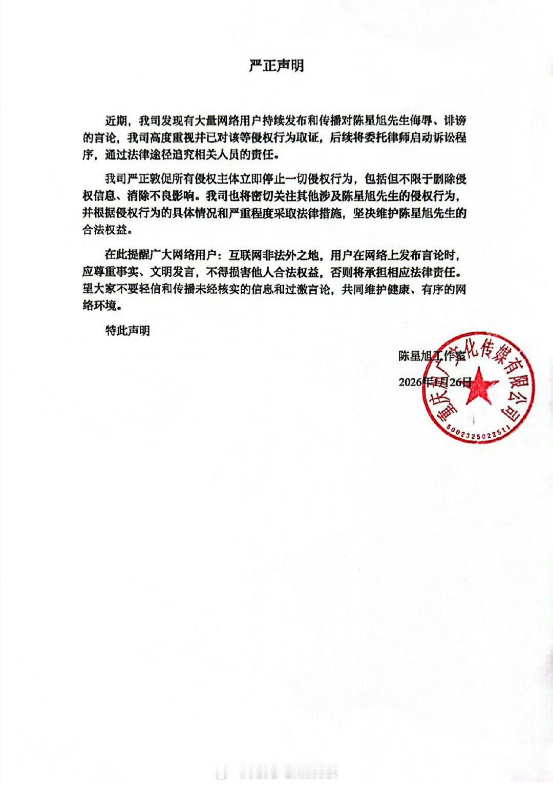陈星旭工作室严正声明陈星旭方已取证 发严正声明:“近期,我司发现有大量网络用户持续发布和传播对陈星旭先生侮辱、诽谤的言论,我司高度重视并已对该等侵权行为取证,后续将委托律师启动诉讼程序,通过法律途径追究相关人员的责任。我司严正敦促所有侵权主体立即停止一切侵权行为,包括但不限于删除侵权信息、消除不良影响。我司也将密切关注其他涉及陈星旭先生的侵权行为,井根据侵权行为的具体情况和严重程度采取法律措施,坚决维护陈星旭先生的合法权益。”