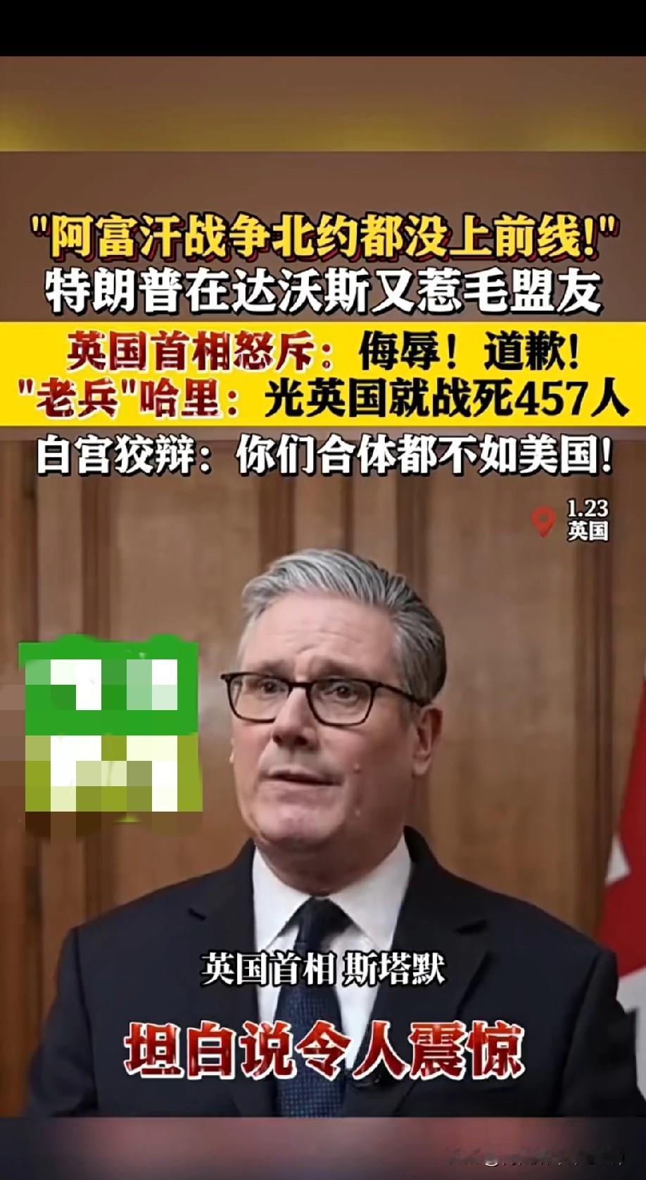 457名英军阵亡、43名丹麦士兵埋骨、59名德军魂断阿富汗,特朗普一句“北约没上前线”,直接把盟友的牺牲踩在脚下! 苏纳克当场暴怒,怒斥这是赤裸裸的侮辱,哈里王子以亲历者身份怒怼,亲眼见战友倒下,血泪岂能被抹杀! 可笑白宫还补刀,称“你们加起来都不如美国”,这份傲慢简直刺眼! 20年阿富汗战争,欧洲盟友跟着美国冲锋陷阵,流血又烧钱,到头来美国仓促撤军甩烂摊子,如今反倒倒打一耙说盟友不出力,这操作太无耻! 说好的盟友团结全是骗局,美国只讲美国优先,把欧洲的牺牲当垫脚石,把盟友当提款机和炮灰! 所谓跨大西洋伙伴关系,不过是美国单方面的吸血游戏,利用完就弃如敝履! 那些长眠阿富汗的将士,成了政客嘴炮的牺牲品,欧洲盟友心里的刺早已根深蒂固,美欧裂痕只会越来越大,这样的同盟迟早散伙!