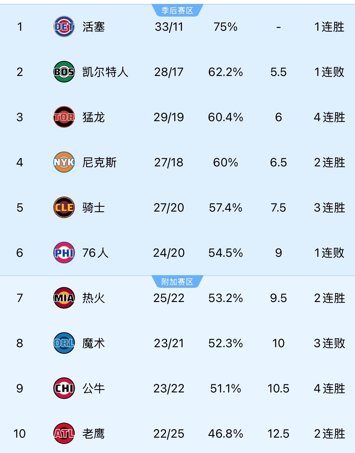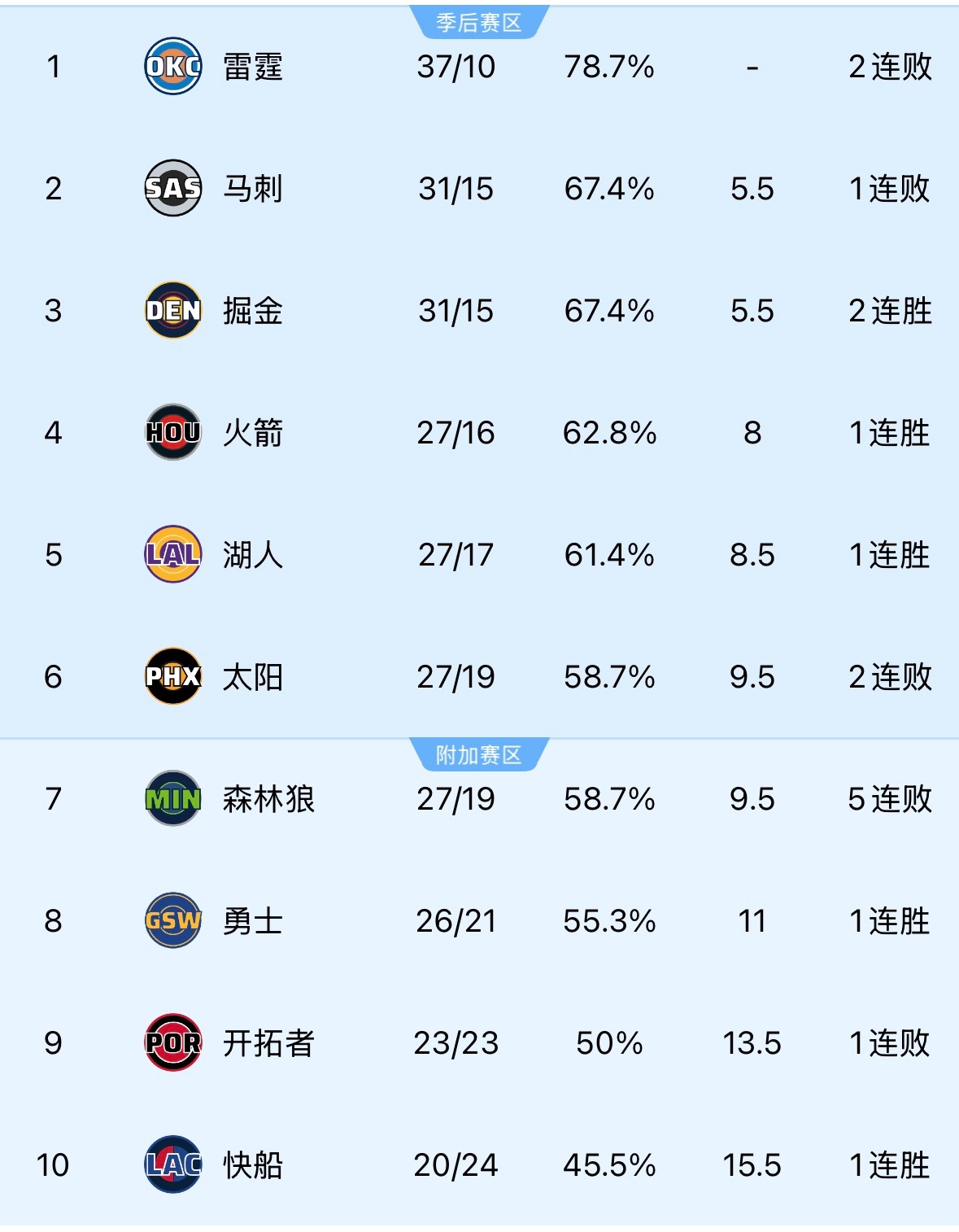 最新的东西部球队排名,活塞稳居东部第一,雷霆稳居西部第一。湖人现在排在西部第五位,距离附加赛就一步之遥,后面一定要多赢球,赛季目标就是别掉进附加赛区吧。nba湖人