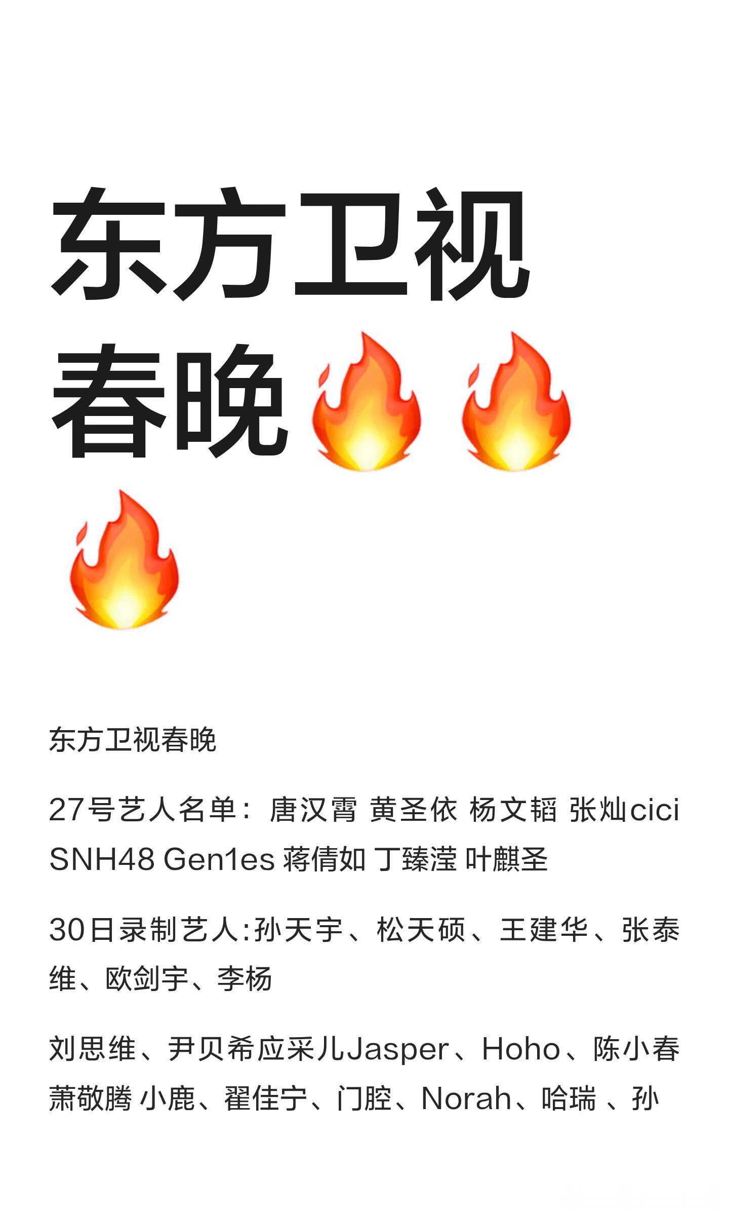 东方卫视春晚艺人名单公布,27号艺人包括唐汉霄、黄圣依等,30日和2.2号还将有更多艺人参与录制,涵盖音乐、舞蹈、戏剧等多个领域。东方卫视春晚|