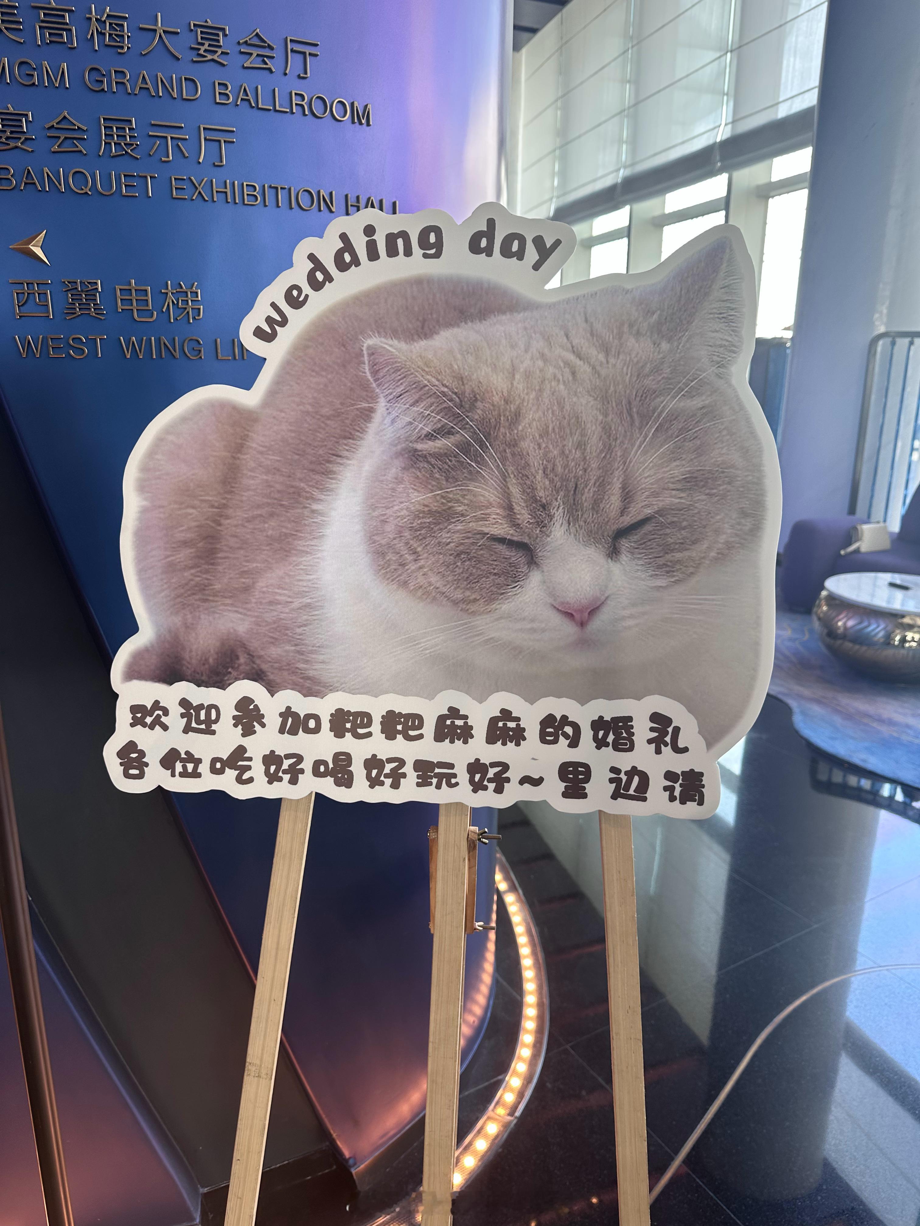 在酒店里看到一个婚礼牌,工作人员几分钟前刚摆出来。有两点疑问:1.这是人结婚还是猫咪结婚?人结婚的话不应该摆两人照片吗?猫结婚的话深圳人就玩的有点高端了,但这猫的名字和人名太接近了吧。2.结婚不都是中午摆酒吗?这应该是晚上摆酒办婚礼,这是啥讲究?晚婚晚育还是老年婚?有懂的朋友吗?