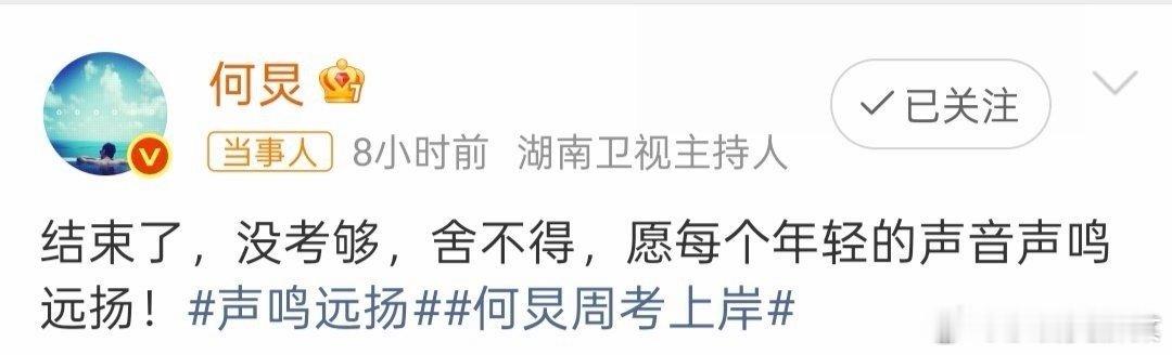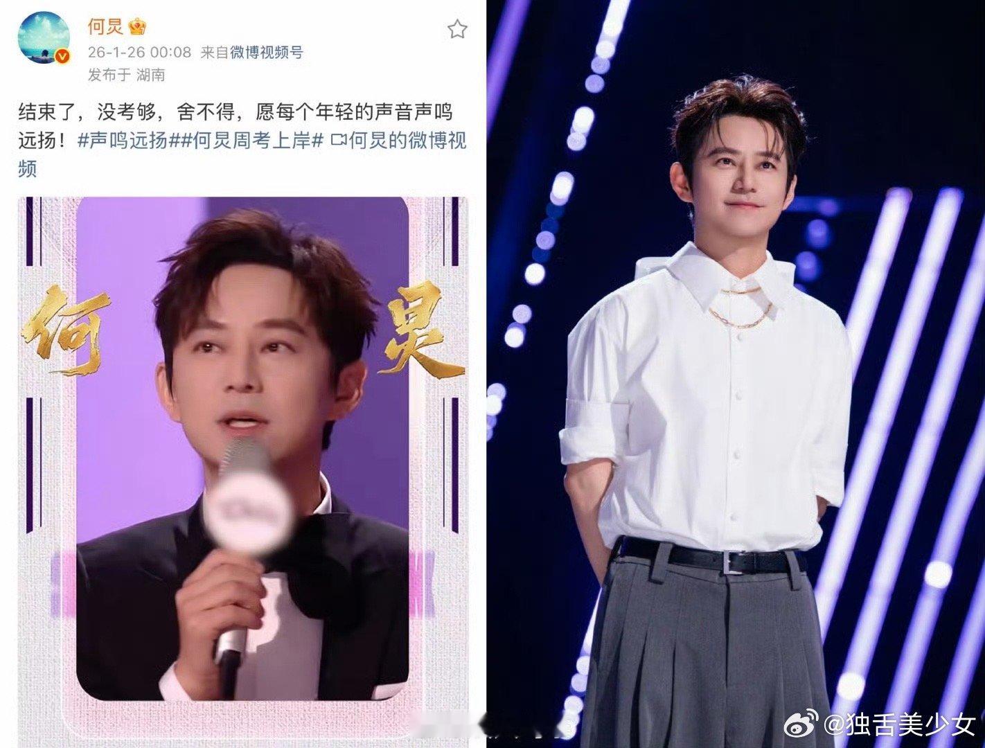 何炅 结束了舍不得一场落幕,万般不舍。从“周日周考”的调侃,到刻进日常的陪伴,何炅用专业和温柔,把每一个舞台都变成了温暖的记忆。结束从不是终点,只是下一场相遇的开始,我们等你再相见❤️声鸣远扬