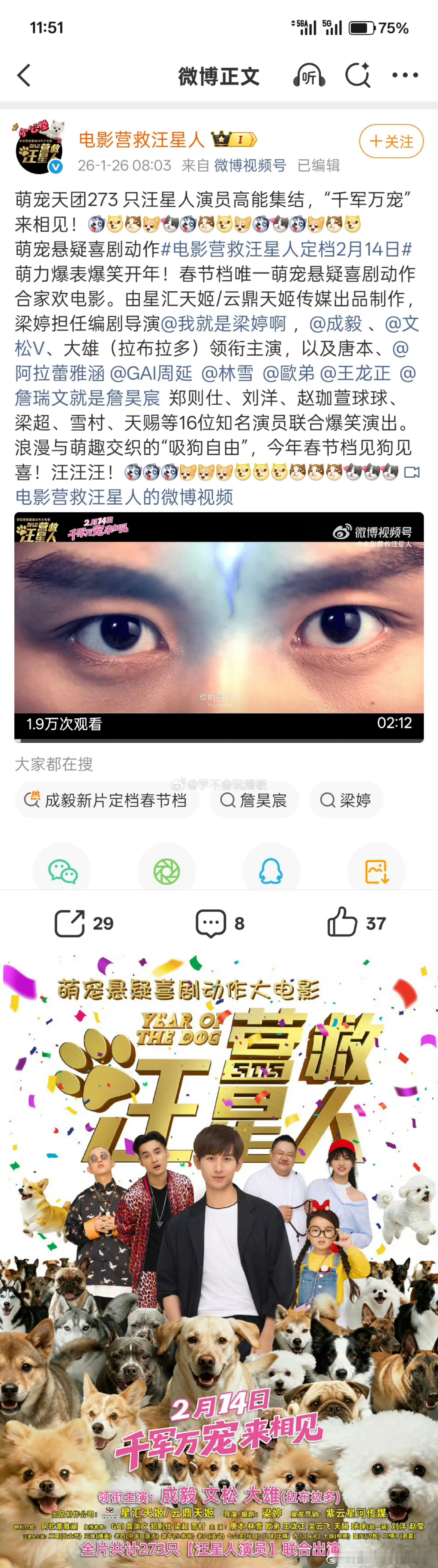 成毅新片定档春节档成毅《营救汪星人》定档2月14日,春节档上映。这是完全要成毅粉丝冲票房啊,都多少年的电影了,居然冲春节档…