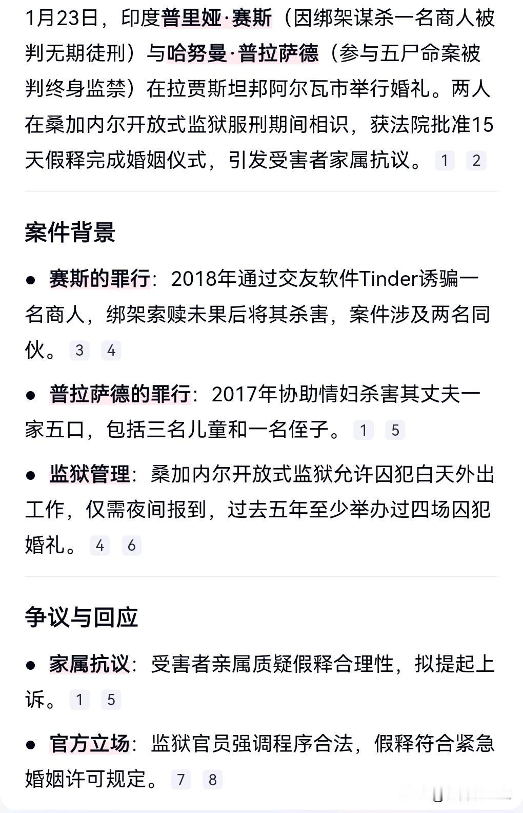 这也太离谱了吧!印度竟然对杀人犯这么厚待的吗? 居然让印度的杀人犯结婚,还给他们假释。 男方杀了一家五口,女方绑架撕票。 他们在监狱中恋爱并结婚。 有够离谱的啊,男女竟然在同一个监狱吗? 更离谱的是监狱还批准他们回老家办婚礼。 受害者家属非常的愤怒,表示抗议,提起上诉。 这监狱的管理也挺奇葩,白天,囚犯可以去外面工作,仅需夜晚报到。