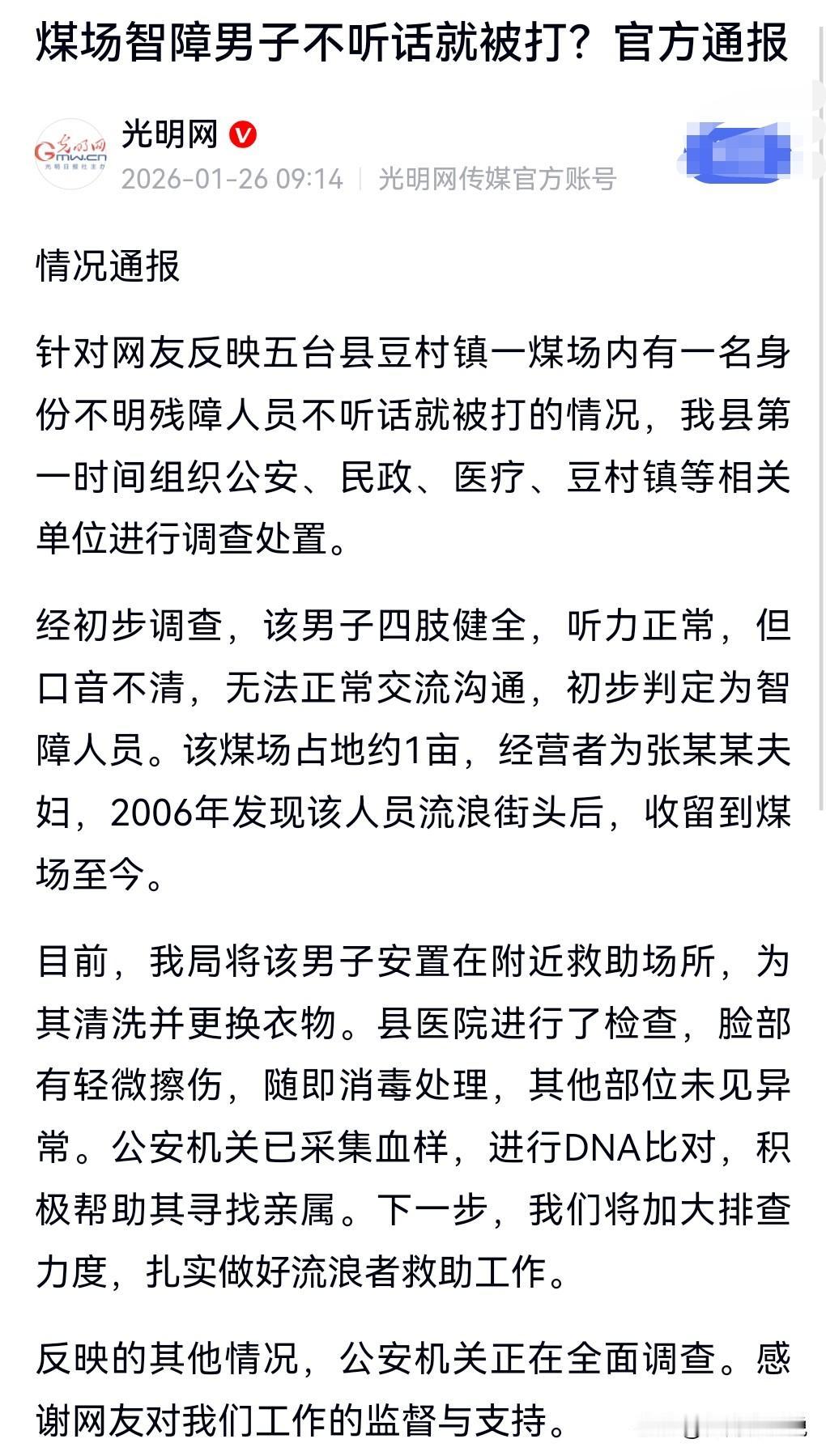 真的有这么好心的人?会无缘无故收留一个智力障碍的人员20年? 而且收留的人是开煤场的。 这对收留智障人员的夫妇,该不会是把这个智障人员当免费劳动力吧! 毕竟有些砖厂也是专门控制智力障碍的人员当苦力。 这里面不得不怀疑呀。 当地通报煤场残障人不听话就被打。 说是夫妇当年在街上看到这个流浪人员,一收留就是20年。 这里面到底是拘禁还是收留,这要搞清楚,一定要实事求是。 这对夫妇开煤场超过20年,而收留此人,那就值得怀疑了。