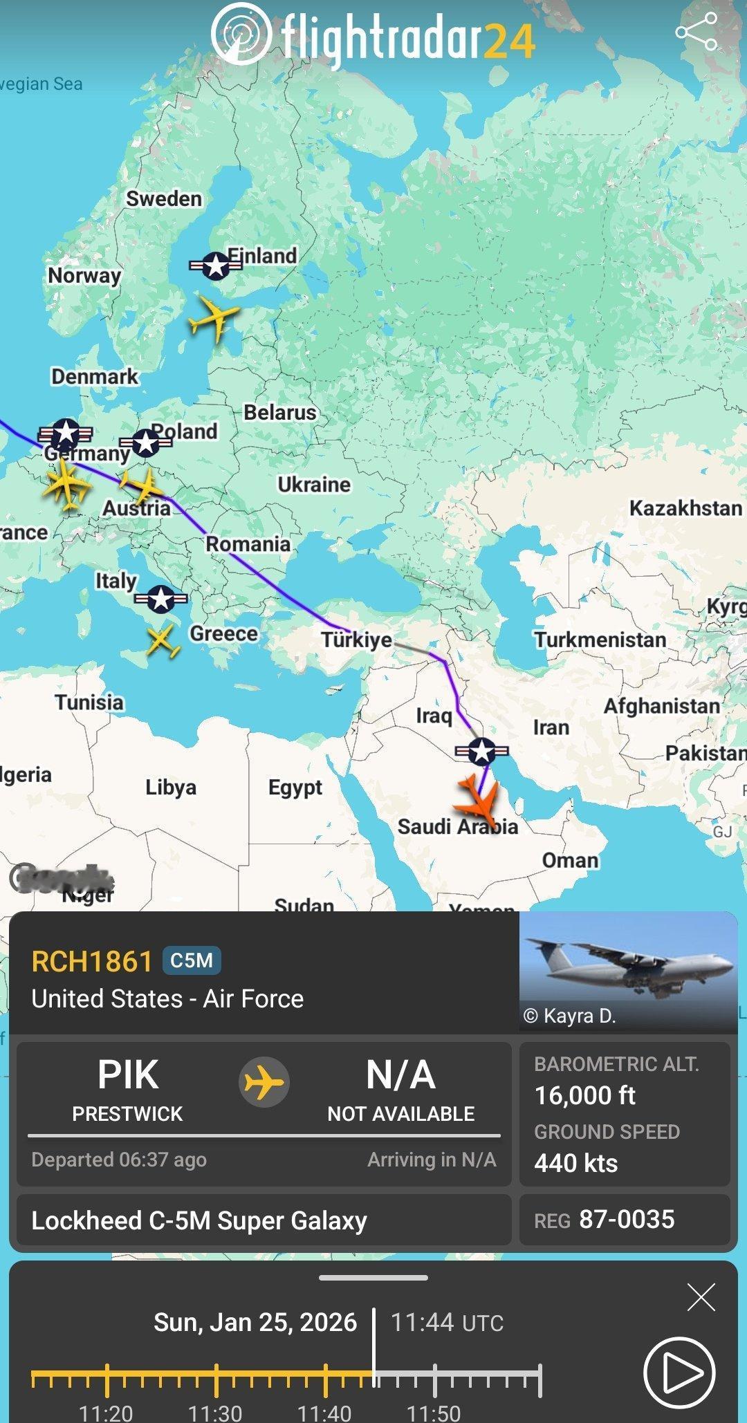 截止当地时间1月25日,美国空军大批C-17A运输机和一架C-5M运输机降落在中东地区,从1月18日至1月25日,美军向中东地区降落41架C-17A运输机,1架C-5M战略运输机。美国战略运输机,C-5M也终于动了。在美军连续出动C-17向欧洲基地、中东基地增援物资、弹药、导弹等后,美国空军C-5M超级运输机出动了,据称向驻沙特的美军基地运输装备,可能是萨德反导系统。美军没有特别重大行动,不会用C-5。显然现在事实清楚了,如果美军开打伊朗,这一次美军可以使用的基地,包括了约旦,叙利亚,以色列,沙特,卡塔尔,阿联酋,科威特,巴林等国。据称,美军向约旦,沙特,以色列运输的武器弹药,导弹,可能超过1200吨了,足够支持美军5-7天高强度空袭了。同时,伊朗当局发布航行通告,限制目视飞行规则飞行和通用航空飞行3个月,这个政策不影响民航客机,显然伊朗进行了航空预警,准备随时开打防空战。对于伊朗来说,现在过于被动了,因为伊朗东侧国家还算比较好,巴基斯坦,阿富汗,中亚,俄罗斯,中国等,都不会允许美军进入,但是伊朗西部,南部,不同了,美军在大量阿拉伯国家,以色列,停满了战斗机,防空导弹,反导,这些武器,都将参与对伊朗的打击与轰炸。现在就看伊朗的战备与还手能力,对于伊朗来说,影响自己生死时刻,即将到了。