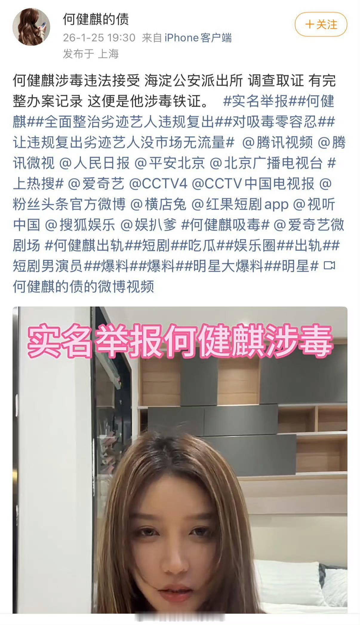 短剧男演员何健麒被前女友举报涉毒。何健麒否认。刚刚他前女友说,去警局完整调查取证
