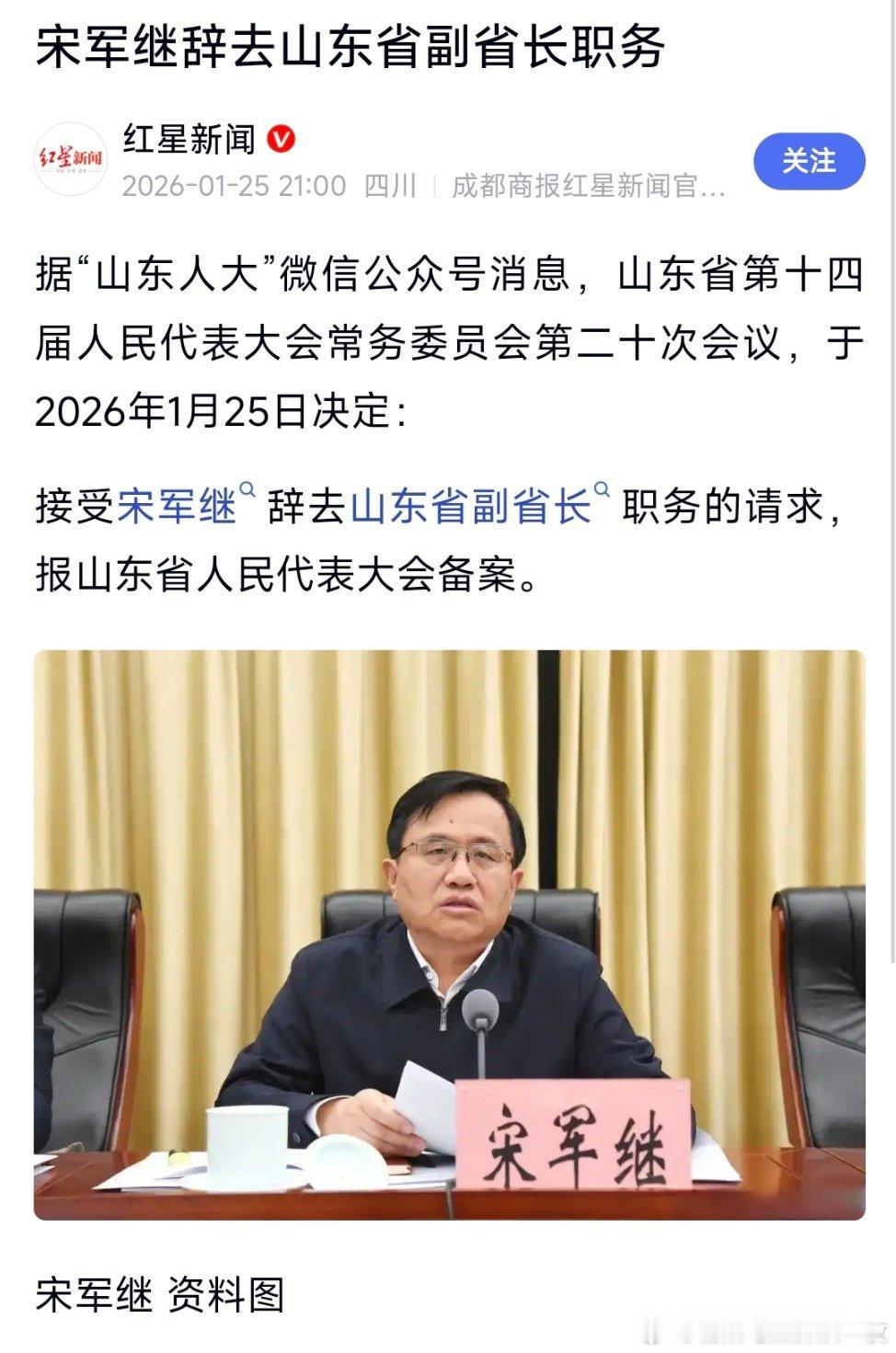 宋军继辞去山东省副省长职务,此前已任山东省人大常委会党组成员。