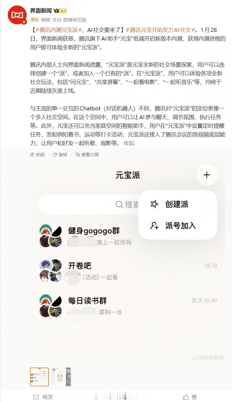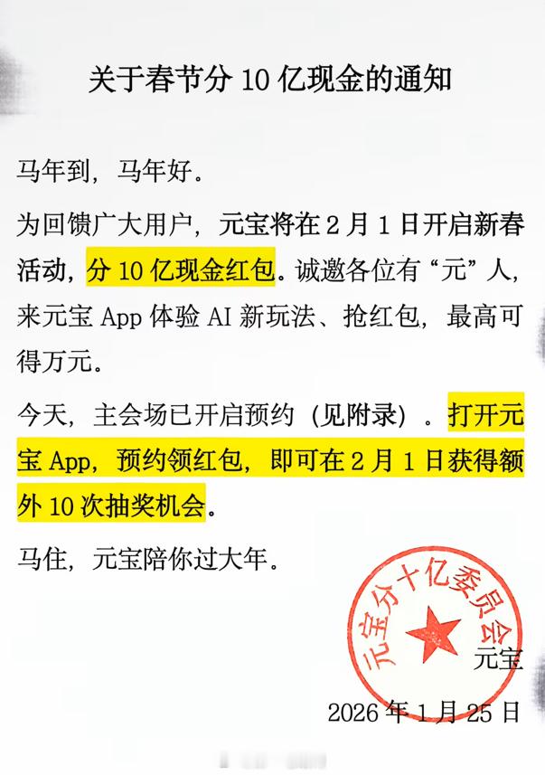 腾讯AI正在内测的“元宝派”,是不是可以简单理解为穿件不同功能的“派”(就如同不同的群),然后这里面有一个AI参与聊天、调节氛围、执行任务(像是群主的作用,还是一个智能活跃的“群主”)而且,腾讯官方发布《关于春节分 10 亿现金的通知》:将在 2 月 1 日上线春节活动,用户上元宝 App 分 10 亿现金红包,单个红包金额可达万元,这比集五福给的多吧!AI春节之战 还有百度文心一言、豆包春节也发福利,看来AI入口大战在春节开始了。。。。不过大家可以碰碰手气领红包腾讯AI人工智能