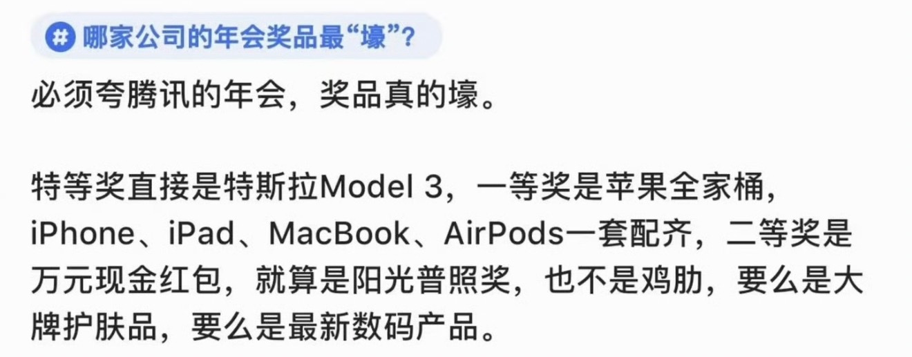 路边社消息,腾讯年会特等奖是特斯拉,一等奖是苹果全家桶,也不知道现在入职还能不能