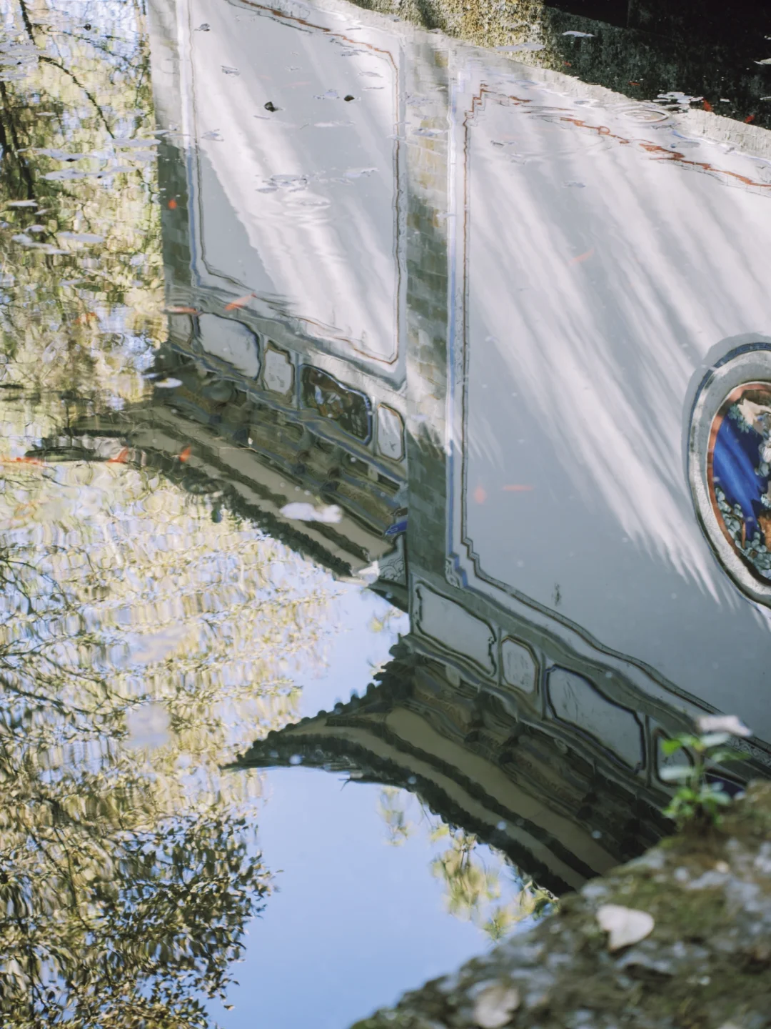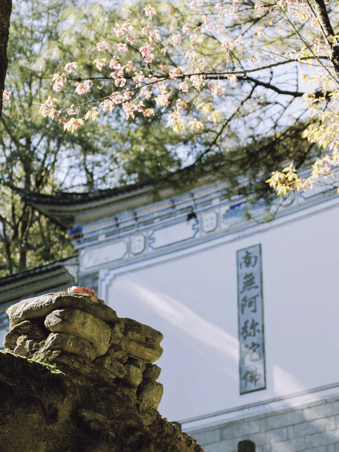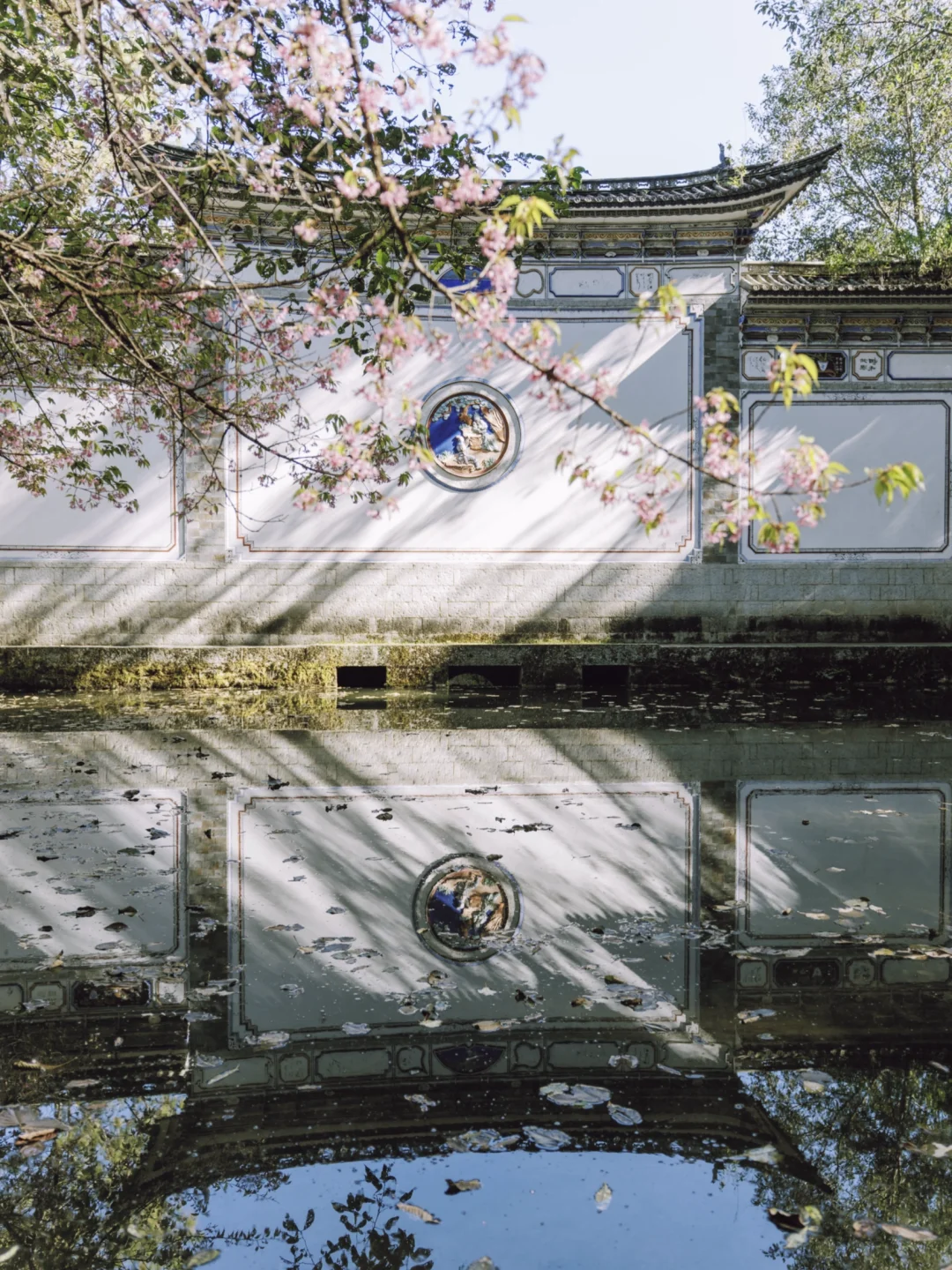 ③白族照壁的背面,拍照壁、水中倒影、樱花同框