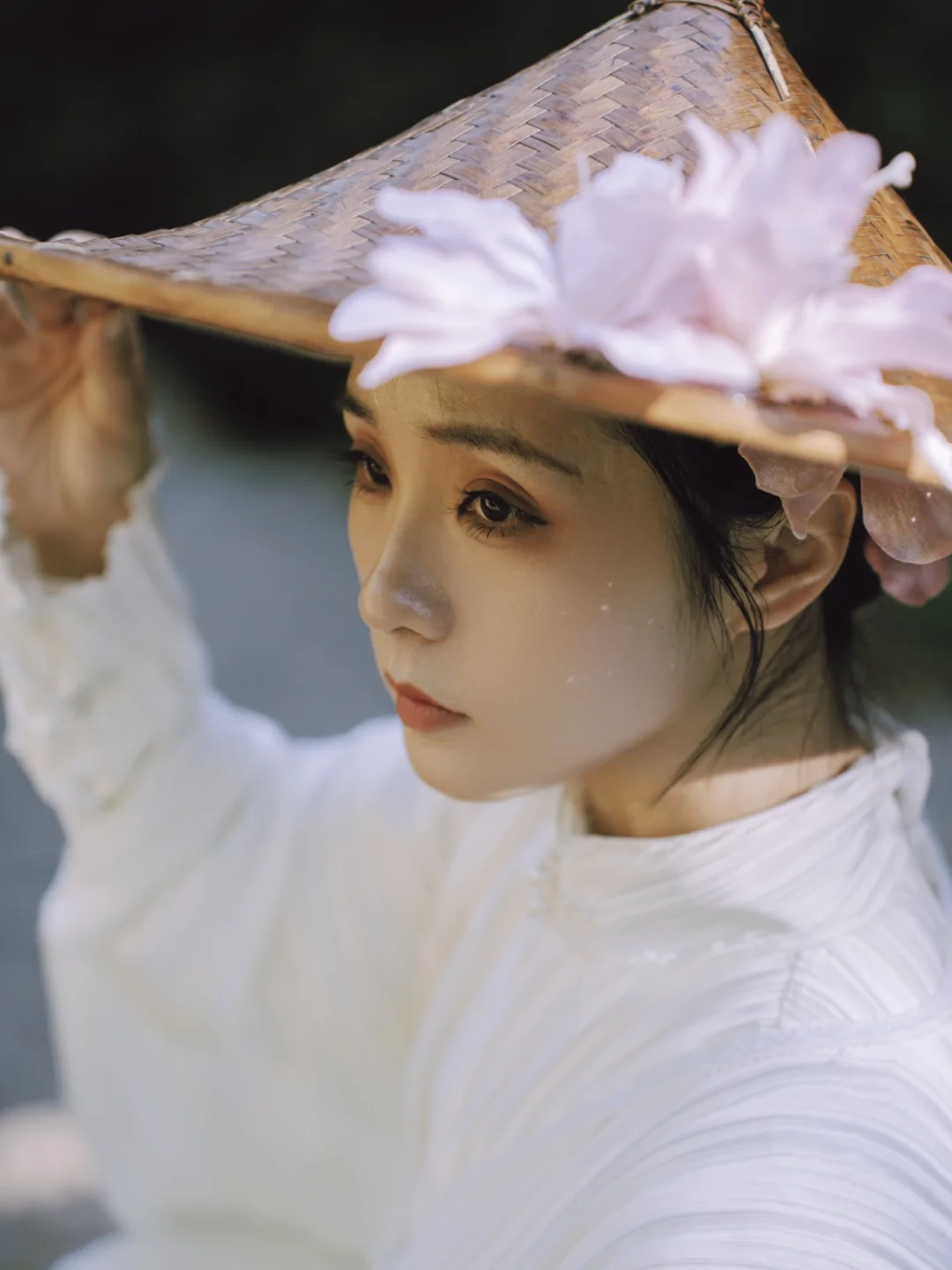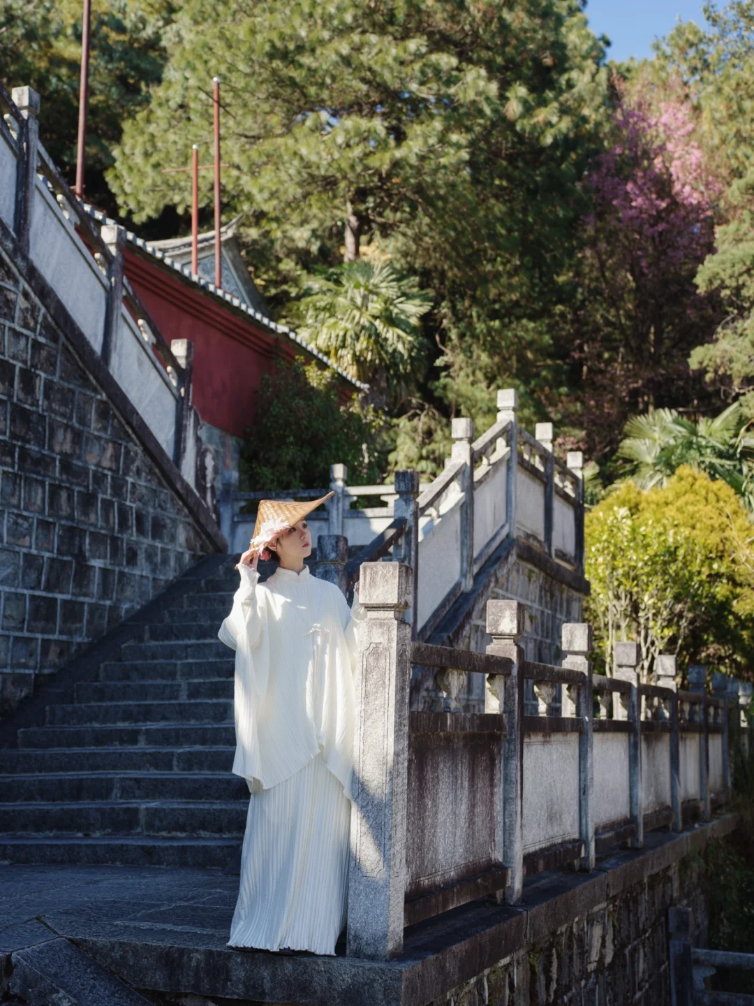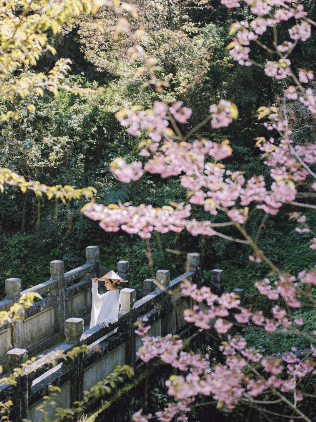 ②人站月涵桥上,以白族照壁前的樱花包围住人
