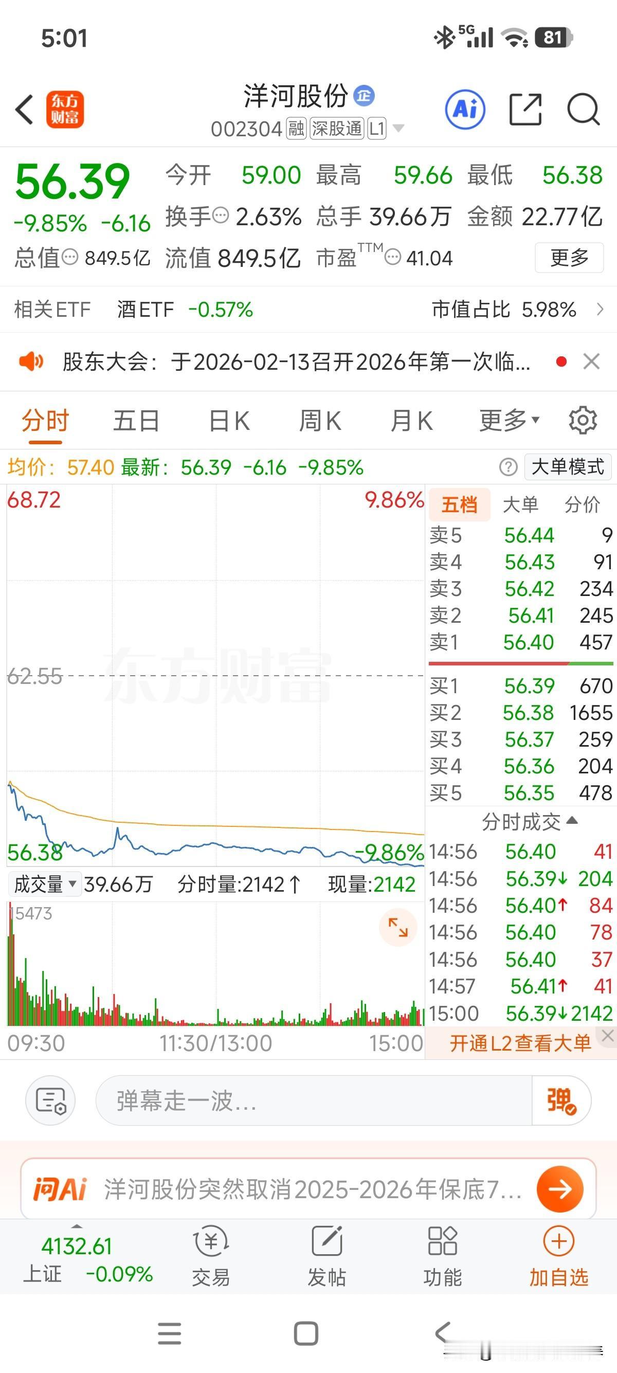 要不容易有止跌迹象,今天被洋河给带崩了!别光看五粮液三季度大幅下滑,底子比洋河高几个段位呢! 洋河股份说百分百利润拿出来分红是利空,换在五粮液绝对是利好,25年保底250亿利润还是有的!另外200亿以上分红额没问题! 能在25年12月就把中期分红发放到位,也是一种变相秀肌肉!之前储备的现金轻松可以度过行业的低迷周期!
