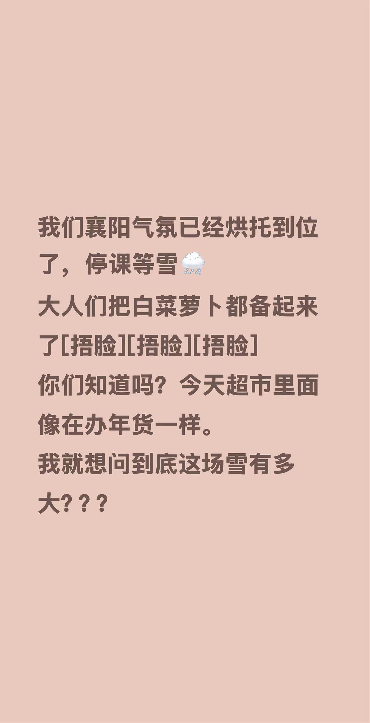 我评论了@襄阳润心 的作品:我们襄阳气氛已经烘托到位了,停课等雪🌨️大人们把白菜萝卜都备起来了[捂脸][捂脸][捂脸]你们知道吗?今天超市里面像在办年货一样。我就想问到底这场雪有多大???湖北暴雪