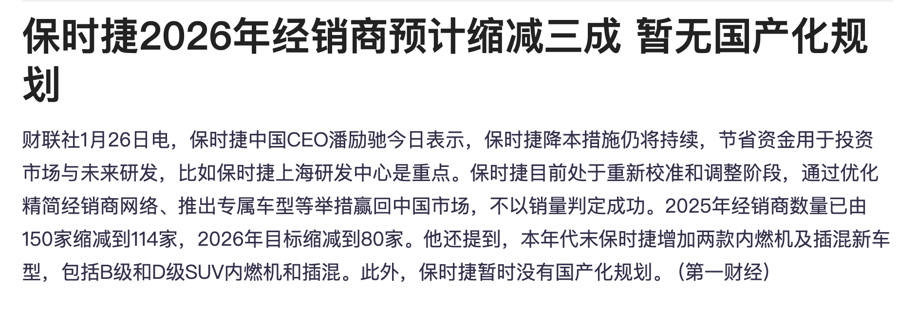 近半经销商将被淘汰!保时捷2026年4S店数量将削减至80家