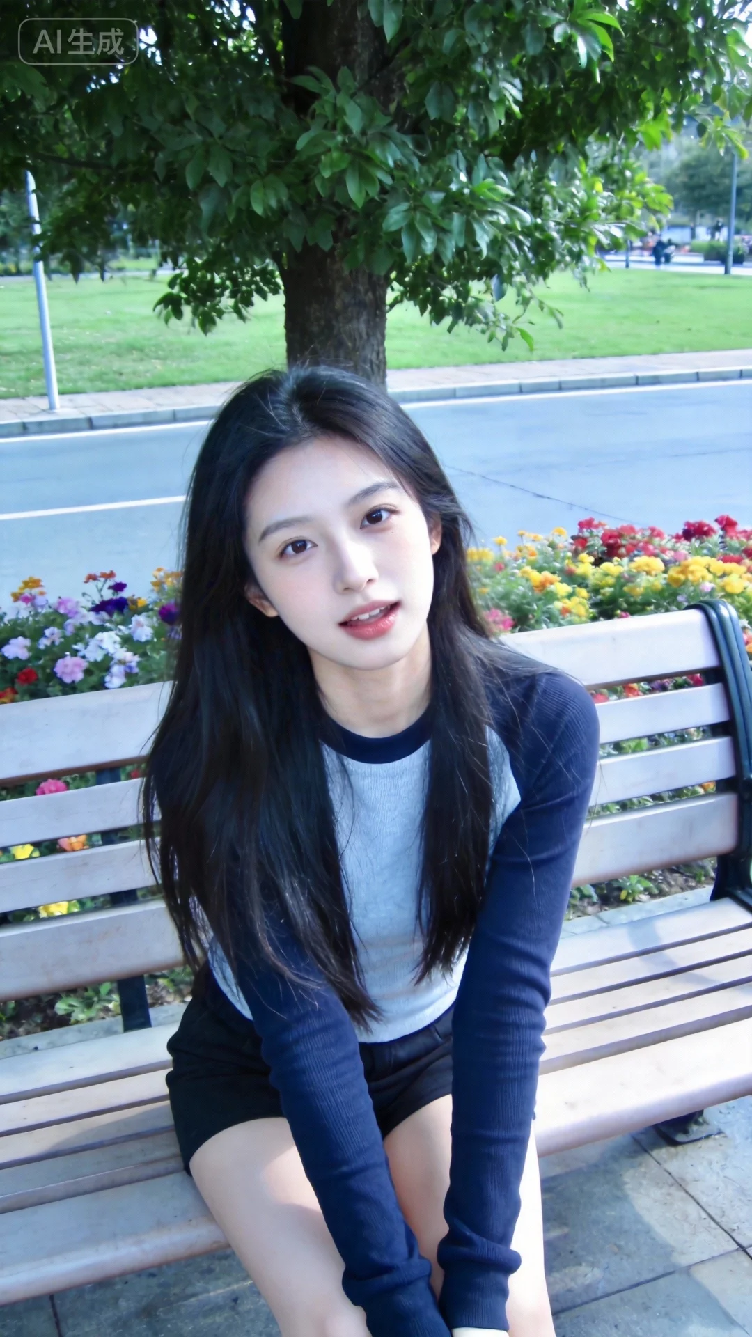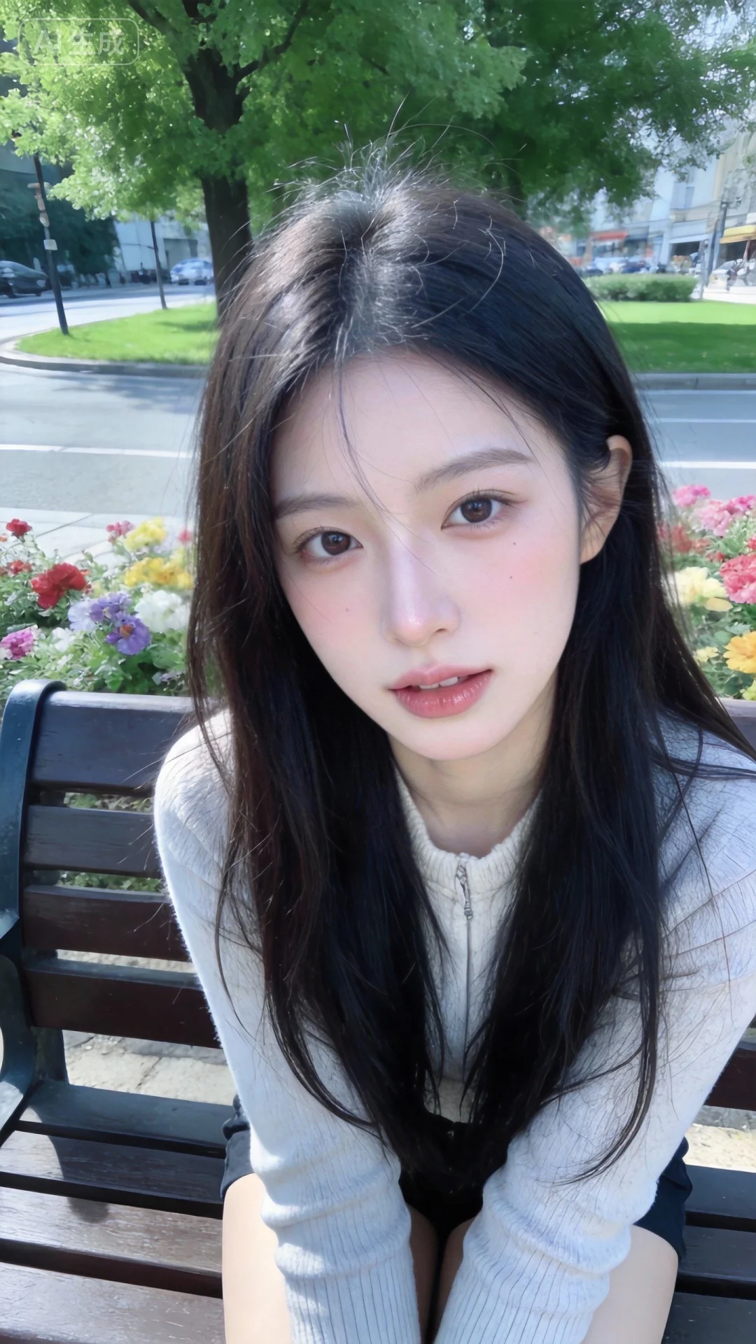 清新写实风,随手一拍的真实感。色调:整体色温偏暖白调(约5800K),饱和度适中(S≈35),明度偏高(V≈80),人物肤色呈现暖白皮质感,保留自然写实的户外光影感。人像摄影,白天自然光,日常快照风格,脸部特写,非精心构图或打光,一位长发美女,冷白皮,少女气质,活泼可爱,活力穿搭,瓜子脸尖下巴,皮肤白皙,发丝清晰可见,皮肤白皙,底妆通透,肤色均匀自然,纯欲风。可爱看镜头,表情自然松弛,照片毫无修饰感,带有生活真实感。ccd拍照感,iphone实拍,坐在街边长椅上,真人,真实生活,长袖秋冬装,长椅后面是绿色大树和草坪、鲜花。脸部特写。
