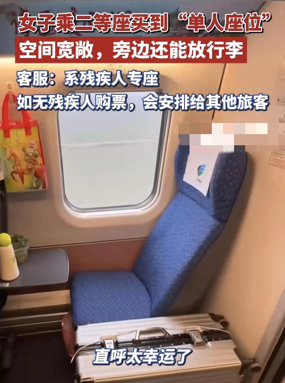 近日有网友发视频称自己乘坐高铁从扬州到呼和浩特,买的二等座位,居然是独享单人座,可见这个座位仅限一个人坐,旁边还可以放下一个行李箱,后边还有专门的充电插座。铁路部门的客服表示,该座位是残疾人专用的,如果没有残疾人购票的话,会安排给其他的乘客,这样的待遇真的是可遇可不可求。