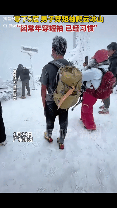 “是个狠人!”广东清远,一男子火了,他身着一件单薄短袖,在零下5℃爬云冰山的视频
