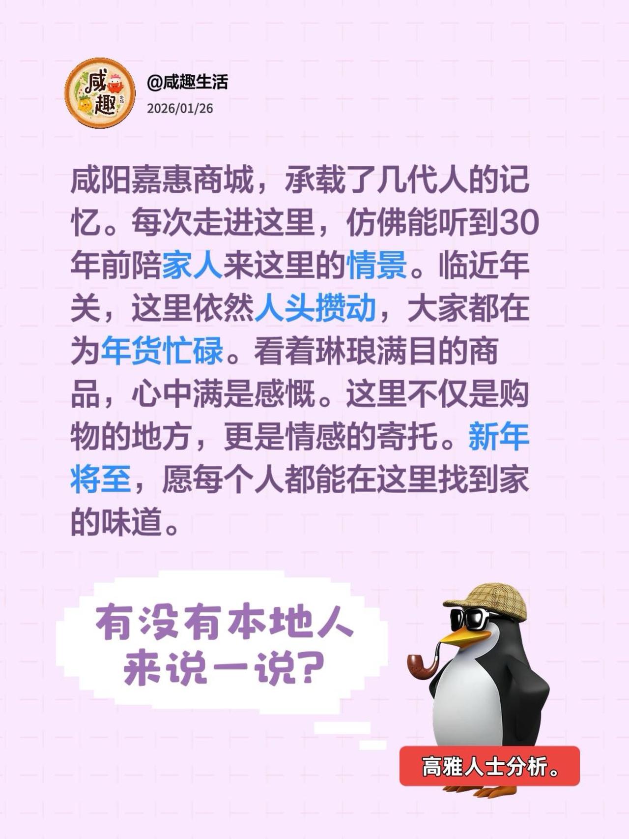 咸阳嘉惠商城,老咸阳人30年的购物记忆!咸阳嘉惠商城,承载了几代人的记忆。每次走进这里,仿佛能听到30年前陪家人来这里的情景。临近年关,这里依然人头攒动,大家都在为年货忙碌。看着琳琅满目的商品,心中满是感慨。这里不仅是购物的地方,更是情感的寄托。新年将至,愿每个人都能在这里找到家的味道。这个东西不白买 咸阳购物