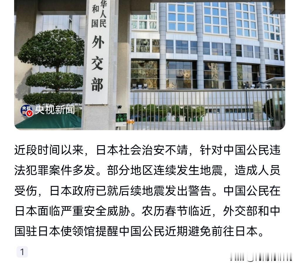 各位同胞们一定要听劝了,这个春节一定要听外交部的,不要去日本旅游。日本治安不太好,容易发生针对中国公民的袭击事件。 而且还有地震的问题。 听外交部的没错,不要去往日本。 要不然出了什么事,那就只有自己负责了。 希望大家过一个平平安安的年,不要去日本。