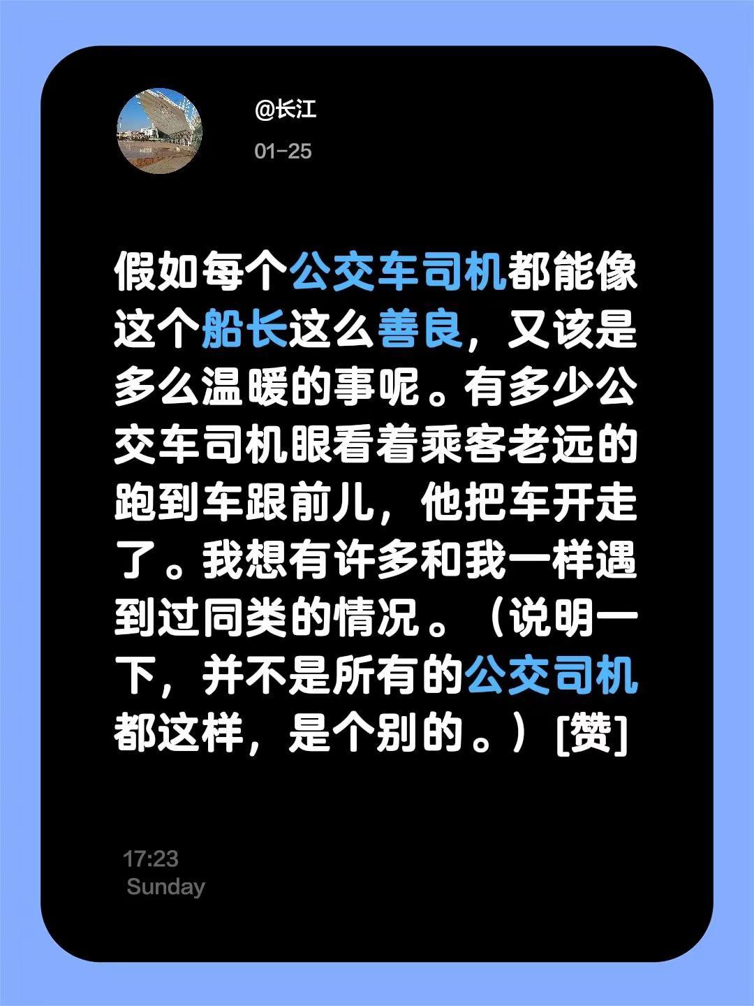 我评论了@风雨来相逢 的作品:假如每个公交车司机都能像这个船长这么善良,又该是多么温暖的事呢。有多少公交车司机眼看着乘客老远的跑到车跟前儿,他把车开走了。我想有许多和我一样遇到过同类的情况。(说明一下,并不是所有的公交司机都这样,是个别的。)[赞]