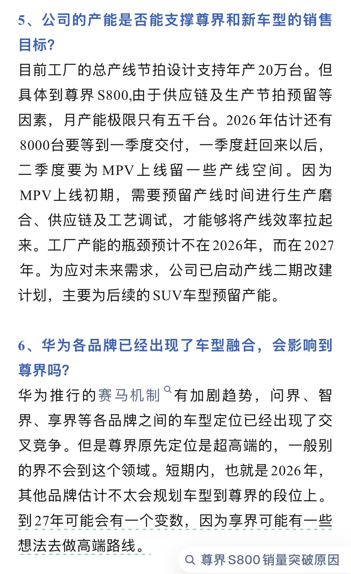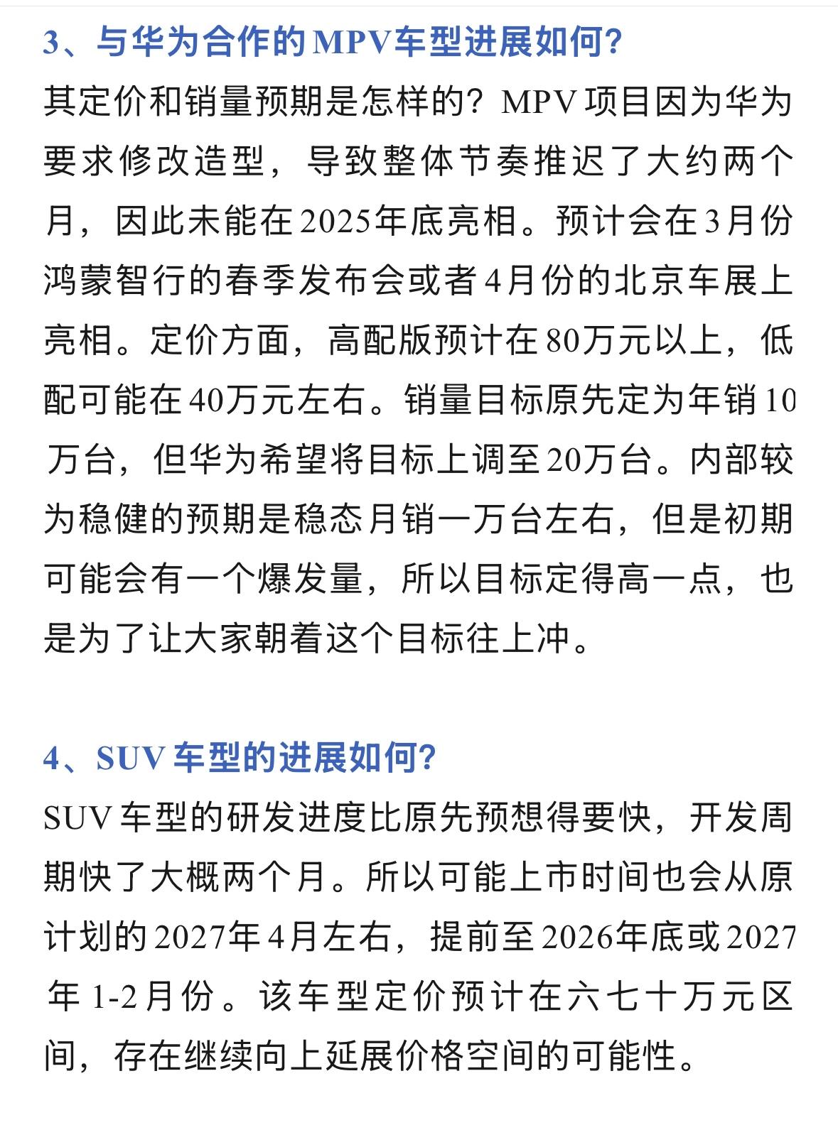 尊界S800在2025年交付量接近1.2万台,目前月销量2000-2500台 2026年尊界销量目标3万台,7-8月份上线尊界S800高定版,售价提升到130万 2026年3月或4月,亮相MPV,定价40-80万,目标年销量20万台 2026年底或2027年1-2月,发布尊界SUV,定价预计60-70万