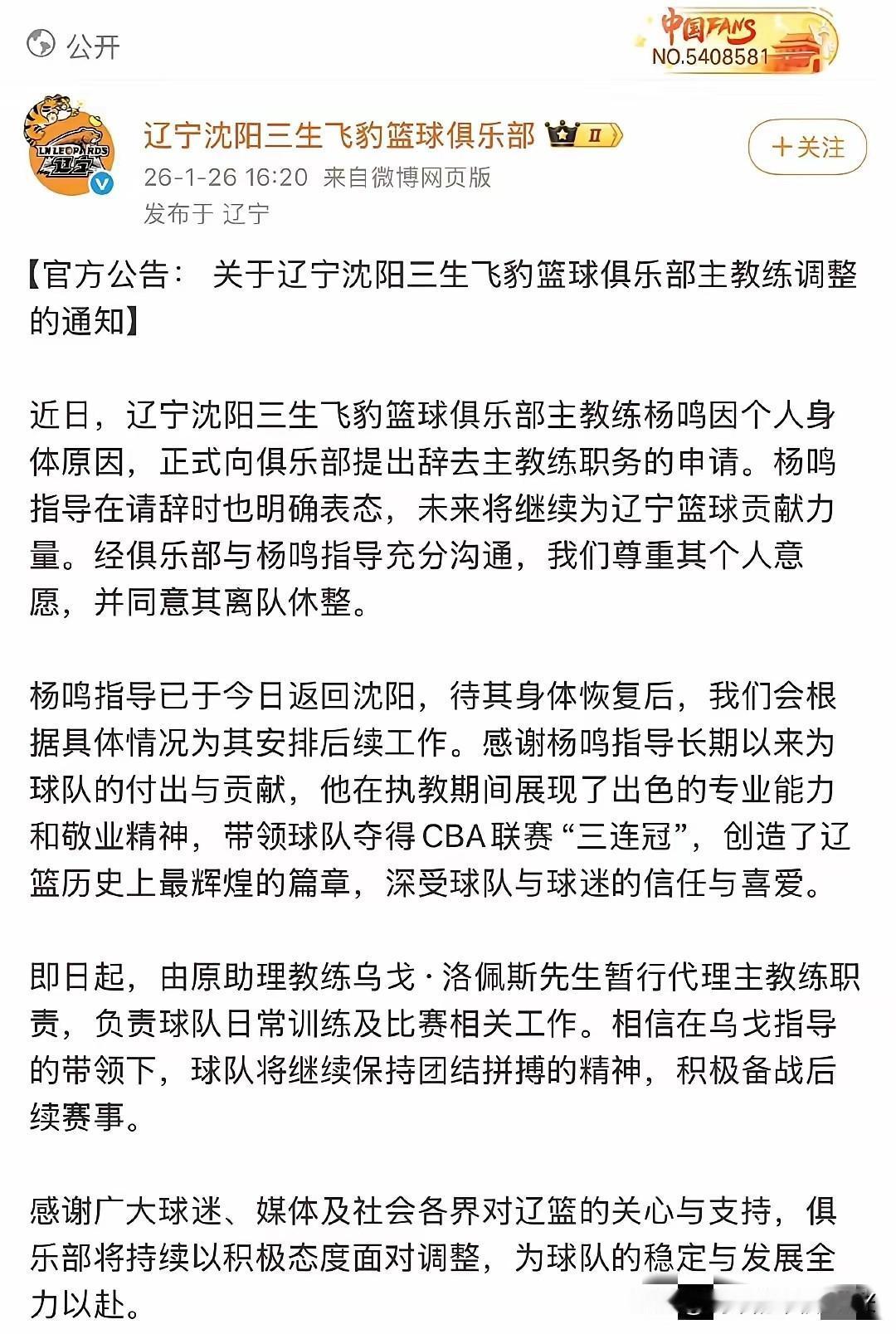 辽宁男篮这波,透着股江湖义气。官宣杨鸣离开帅位,字里行间全是留白——“乌戈暂行代理”“杨鸣离队休整”“俱乐部安排后续工作”。这哪是告别?分明是给彼此留了台阶,等着某天再续前缘。 谁都看得出,这是眼下最妥当的结局。杨鸣暂时卸下教鞭,不用再日夜盯着赛场胜负,俱乐部也没把话说死,明摆着留着位置。球迷心里的石头落了地,毕竟这支队伍里,杨鸣的名字早和“辽宁”绑在了一起。 从球员到教练,他在场边吼过、笑过、红过眼眶,那份对球队的在意,藏不住。休整归休整,回来后往哪站?总教练?还是总经理?不少人猜后者更合适。 就说选外援这事儿,这些年球迷没少念叨,小刘总挑的人,要么水土不服,要么打不出身价,说到底还是钱袋子紧,可眼光也确实差点意思。杨鸣在圈里摸爬滚打这么多年,看人准,懂球队需要啥风格,真要是坐进总经理办公室,说不定能把外援这块短板补上。 当教练时,他敢用人,也护着队员。输球了自己扛,赢球了把功劳推给大家,更衣室里的凝聚力,多半靠他这股劲儿。真转去管理岗,这份亲和力未必是坏事。 俱乐部里上上下下,从老队员到年轻球员,谁不买他几分面子?协调关系、理顺思路,或许比埋头在战术板前更能发挥作用。再说总教练的位置,听着风光,实则压力山大。每一场球都像在走钢丝,输赢都被放大。 杨鸣这几年头发白了不少,肉眼可见的累。趁着休整喘口气,换个角度看球队,未必不是好事。等想明白了,再回来掌舵,说不定能有新想法。 辽宁男篮向来重情义,当年李晓勇、郭士强这批人,离队后也没断了联系,关键时刻总能为球队出份力。杨鸣这一走,不是散伙,是中场休息。俱乐部那句“安排后续工作”,像句承诺,也像个约定——你先歇歇,我们等你。 球迷心里有数,杨鸣不会真离开篮球。他对辽宁队的感情,比输赢更重。当年作为球员,他拼到跟腱断裂还想上场;当教练,哪怕嗓子喊哑了,也得站在场边。这种骨子里的归属感,不是说断就能断的。 接下来就看俱乐部怎么安排,总经理的活儿,琐碎却关键,管钱、管人、管方向,得有手腕,也得有情怀。杨鸣要是能扛起来,既能避开赛场的直接压力,又能继续为球队操心,算是两全其美。 至于选外援的难题,有他把关,至少能少走些弯路,别再让“钱花不到刀刃上”的遗憾重演。乌戈暂时接手,也算平稳过渡,他跟着球队这么久,熟悉战术体系,不至于让队伍乱了节奏。 这段时间,正好让杨鸣彻底放空,想想接下来的路。是回赛场继续指挥,还是转去幕后运筹,都得他自己掂量。辽宁男篮这步棋,走得稳。既照顾了杨鸣的状态,也稳住了球队的军心,更给了球迷念想。 说到底,体育圈的情义,不就是赢了一起狂,累了给你靠,等你准备好了,再一起往前闯?杨鸣的休整,不是结束。等他回来那天,不管是坐在教练席,还是走进办公室,辽宁球迷多半还会喊那句“杨导,加油”。 这份期待,就是最好的证明。