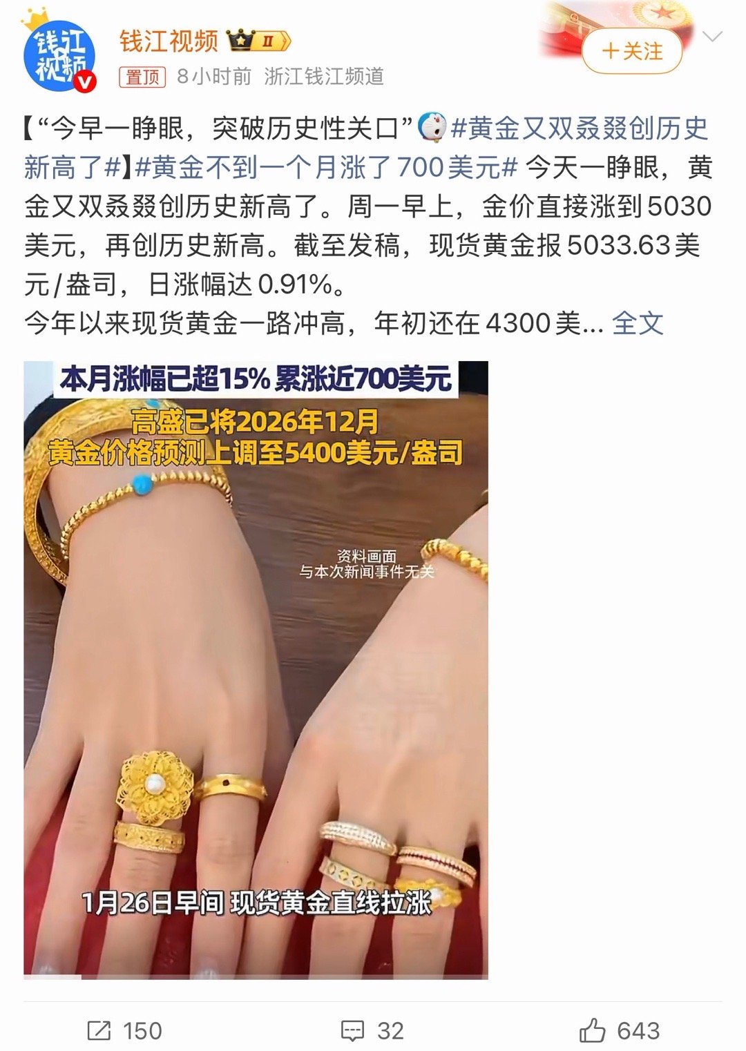 黄金不到一个月涨了700美元刚在商城吃饭的时候,路过金店问了一嘴,今天的金价1200元一克,这价格说实话我真不知道会有多少人去买,相对于年前贵了500块了