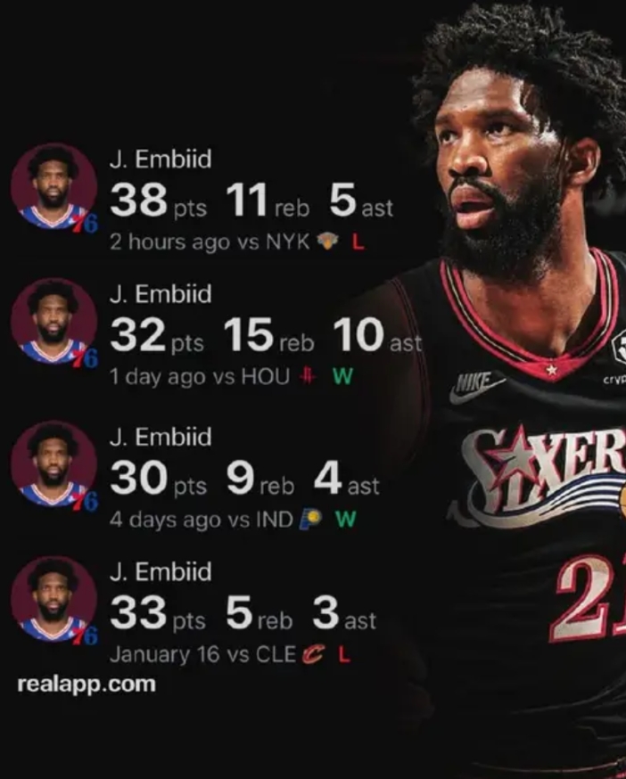 恩比德再这么打下去,不光全明星在招手,MVP都可以讨论一下了 33分,30分,32分,38分,这是恩比德连续四场给出的得分数据,上一场比赛更是上半场12中10砍下28分,全场38分11板5助攻。再往前看,恩比德已经连续15场比赛都拿到20+的得分数据了。 都伤成这样的恩比德,居然还能重返全明星水准,真的牛!!!这赛季的恩比德若真能复活,按照76人现在的配置,完全可以有点想法了!#