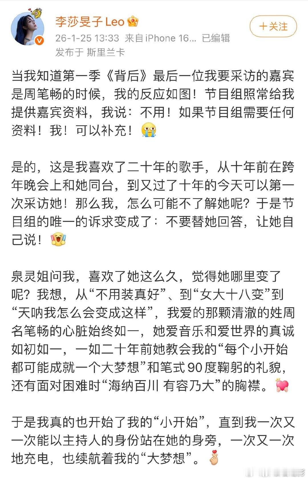 李莎旻子20年后首访周笔畅李莎旻子和周笔畅的故事也太好哭了吧!从默默仰望的粉丝到并肩对话的同行,二十年的喜欢太值了!湖南卫视背后