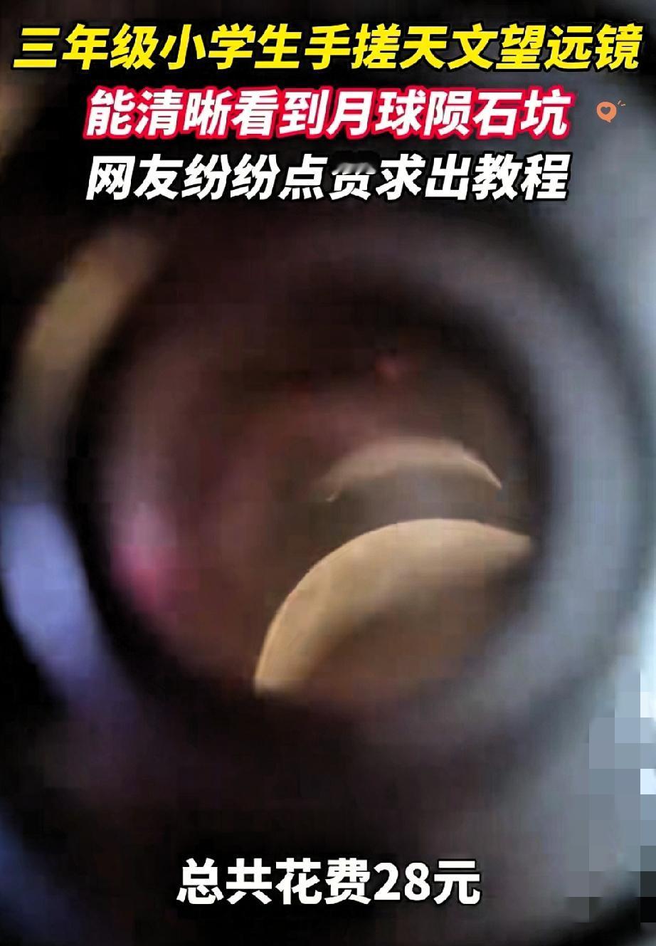 人民日报都点赞的10岁小孩哥! 广东揭阳男孩不打游戏不追剧,靠纸箱PVC管自制天文望远镜,28块钱成本竟能看清月球陨石坑,这天赋太绝了! 三年级的他痴迷天文,放学后就捣鼓小发明,望远镜核心镜片网购,其余全是家里的废纸壳、瓶盖、棉签,随手捡的材料拼出了能探月的神器,观测时月球上的坑洼纹路看得清清楚楚。 全网都在夸他是天文学家苗子,可我觉得更难得的是这份专注,现在好多孩子被电子产品绑住,少了动手探索的乐趣,而兴趣才是最好的老师,这份热爱比任何补习班都管用。 不是每个孩子都要成天才,但保护好他们的好奇心和动手欲,就是给未来留了无限可能,家长多给点空间,孩子就能交出惊喜答卷。 人民日报点赞的不只是望远镜,更是少年身上的探索劲儿,这才是新生代该有的模样! 你家孩子有特别痴迷的兴趣吗?会支持他放手去尝试吗?