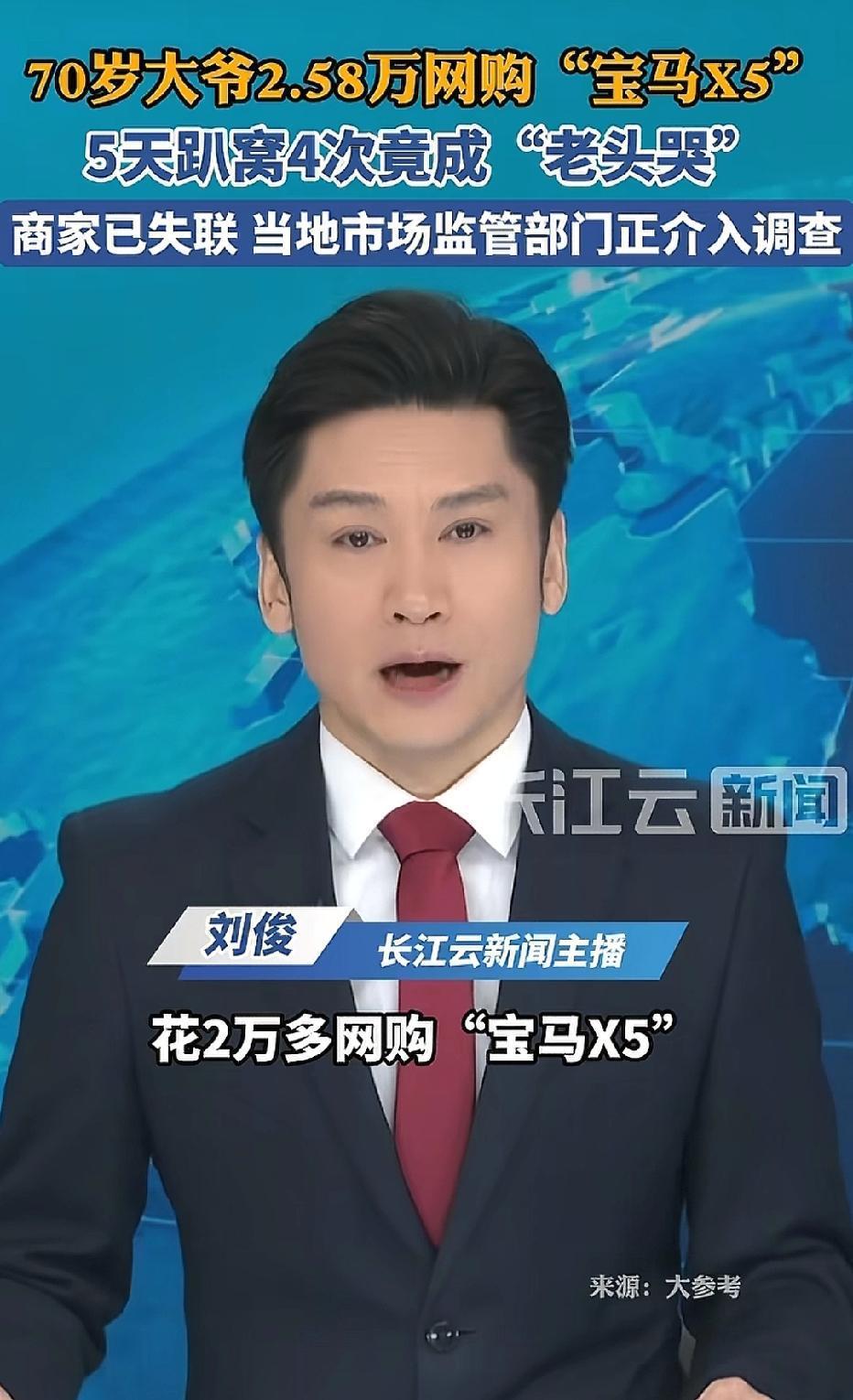 江苏,78岁大爷在网上看到10800元能买“宝马X5”,他以为是宝马出厂款,先后交定金、运费等合计25800元,客服承诺宣传返现15000元。结果大爷提车傻眼:证件造假、噪音大,开5天仅跑50公里就彻底趴窝,售后客服直接失联,大爷家属称:25800元竟买了个废铁空车架! 闫大爷这几天愁得吃不下饭、睡不着觉,实在没辙,红着眼眶找来记者求助。 他说起自己的糟心事,声音满是委屈和气愤。 闫大爷闲来无事总爱刷手机,前段时间刷到一直播间,主播拿着牌子喊着“宝马X5老年代步车仅10800元”。 大爷一辈子没开过好车,一看是“宝马”款,又想着是老年代步车,满心以为是宝马厂家出的正规车。 他觉得这价格太让人心动了,心里瞬间乐开了花,当即就动了购买的心思,想着买辆代步,出门遛弯、买菜也方便。 没多想的闫大爷立马联系了客服,对方说话热情又客气,一口答应能发货,却转头提出要先交2000元定金留车,大爷没犹豫,当即转了账。 可定金交完没几天,对方又打来电话,说车子跨省运输需要3000元运车费,还说后续还有些杂项费用,七七八八算下来,让大爷再补钱,承诺补完就能发车。 大爷一心盼着提车,想着反正后续还有返现,便东拼西凑,前前后后一共给对方转了25800元。 对方还拍着胸脯保证,只要大爷收到车后,每月帮忙在朋友圈、邻里间宣传3次。 连续宣传12个月,就能每月返1250元,12个月累计返现15000元,算下来这车实际就花10800元,大爷听着觉得特别划算,更是安心等着收车。 闫大爷拿到车后,他发现这辆所谓的“宝马X5老年代步车”,续航标的是270公里,实际跑不到50公里。 他才开了5天,半路抛锚4次,拖车绳都拉断了,好不容易将车子拉回来。 闫大爷联系客服问怎么回事,客服说电瓶坏了,让他把电瓶邮寄过来,再给他换新的。 闫大爷照做,可是对方却迟迟不给他发新的电瓶过来。 老伴和子女都埋怨他买了一堆废铁,一看就是假的。 但闫大爷想着钱都花了,等电瓶到了将就着开吧。 可车子开起来噪音大得刺耳,震得人耳朵疼,老伴担心危险,再也不敢坐进去。 慌了神的闫大爷发现车子毛病越来越多,零件还掉了,他赶紧掏出汽车合格证看看真伪,越看越假,他又手机联系客服,想找售后维修。 可无论怎么打语音、拨电话,对方都毫无回应,发消息也石沉大海,当初热情的客服彻底失联了。 闫大爷不死心,接连打了好几天,始终联系不上人,这才意识到自己被骗了。 家属更是又心疼又气愤,直言这25800元,对普通老人来说可不是小数目。 结果竟买了个毫无用处的废铁空车架,好好的一笔钱,就这么打了水漂,连个说理的地方都没有。 闫大爷没办法,只好找来了记者,希望能给他讨个公道。 记者发现,闫大爷买的压根就不是正规的宝马车标。 闫大爷表示,他也不懂,当初只觉得车子好看,谁知拿到手后,故障不断。愁得他不知道怎么维权,把自己的血汗钱追回来。 记者根据闫大爷转账记录,查到了收钱方的信息,已将这件事反馈给当地市场监管局。 目前,此事正在调查中。 此事曝光后,网友们纷纷留言热议,满屏都是心疼和气愤。 有人惋惜:78岁的大爷,攒2万多块得多久啊,就这么被忽悠买了个废铁架子,开5天就趴窝,想想都心疼。 还有人忍不住吐槽:10800买宝马X5代步车,但凡多想一秒都知道是坑!可老人哪懂这些,就被骗子的花言巧语骗了。 家里有老人的一定要多叮嘱!网上买大件千万别私下转钱,低于市场价的全是猫腻,掏钱前一定跟子女商量。 也希望相关部门严查到底!不仅要帮闫大爷把钱追回来,更要端掉这种诈骗窝点,别再让更多老人上当了。 大爷太实在了,对方说返现就信,东拼西凑把钱交齐,结果落得这地步,真的太冤了,必须帮大爷维权到底。 对此你怎么看?